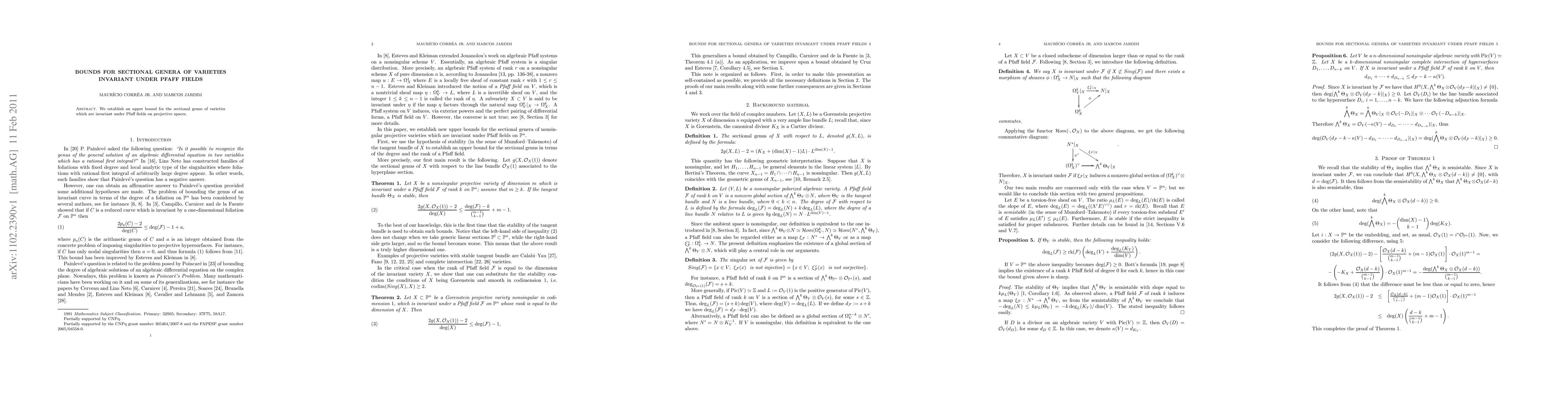 Summary: This paper sets an upper limit on the sectional genus of varieties that maintain invariance under Pfaff fields within projective spaces, contributing to the understanding of their geometric properties.