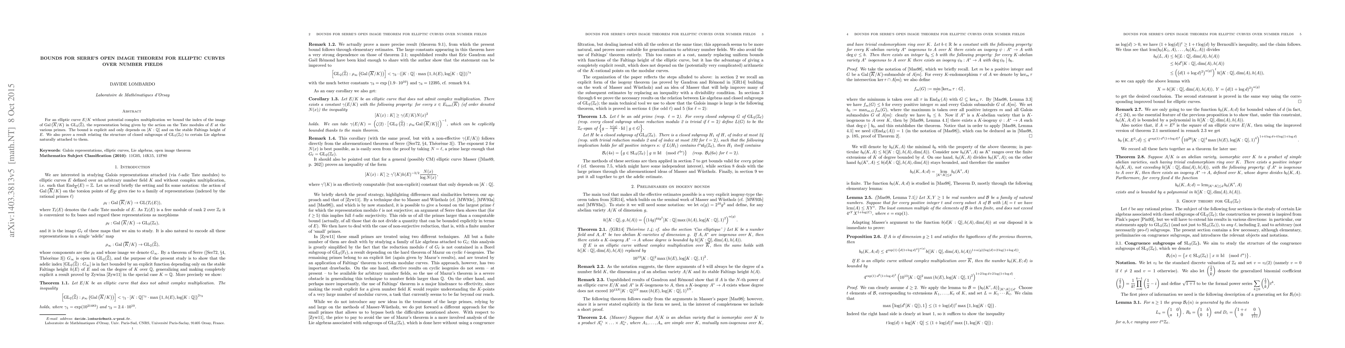 For $E/K$ an elliptic curve without complex multiplication we bound the index of the image of $\operatorname{Gal}(\bar{K}/K)$ in $\operatorname{GL}_2(\hat{\mathbb{Z}})$, the representation being given by the action on the Tate modules of $E$ at the various primes. The bound is effective and only depends on $[K:\mathbb{Q}]$ and on the stable Faltings height of $E$. We also prove a result relating the structure of subgroups of $\operatorname{GL}_2(\mathbb{Z}_\ell)$ to certain Lie algebras naturally attached to them.
