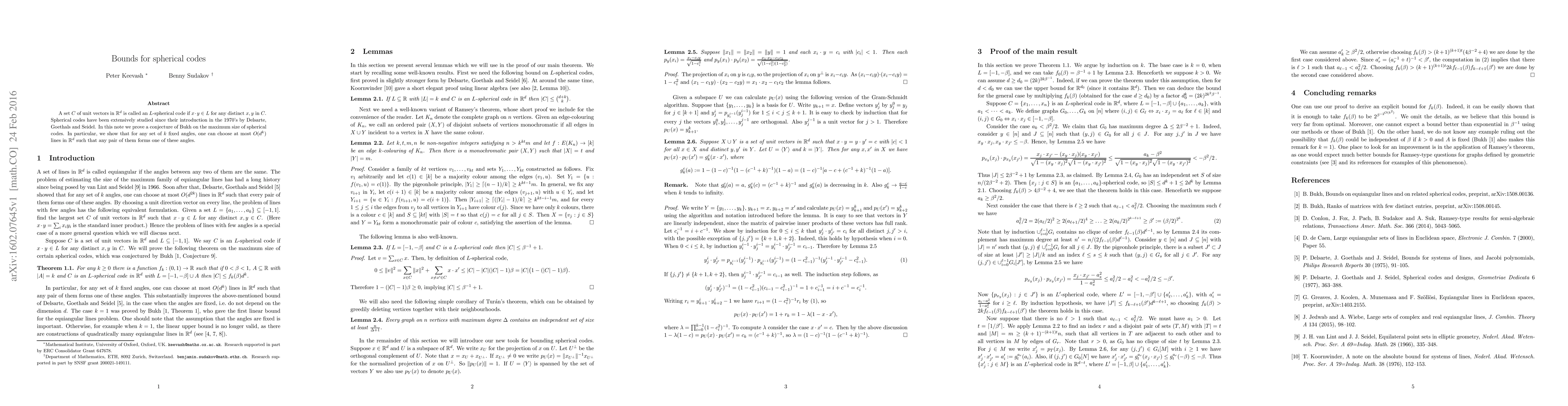 The paper proves a conjecture of Bukh on the maximum size of spherical codes using lemmas from linear algebra, Ramsey's theorem, and Turán's theorem.