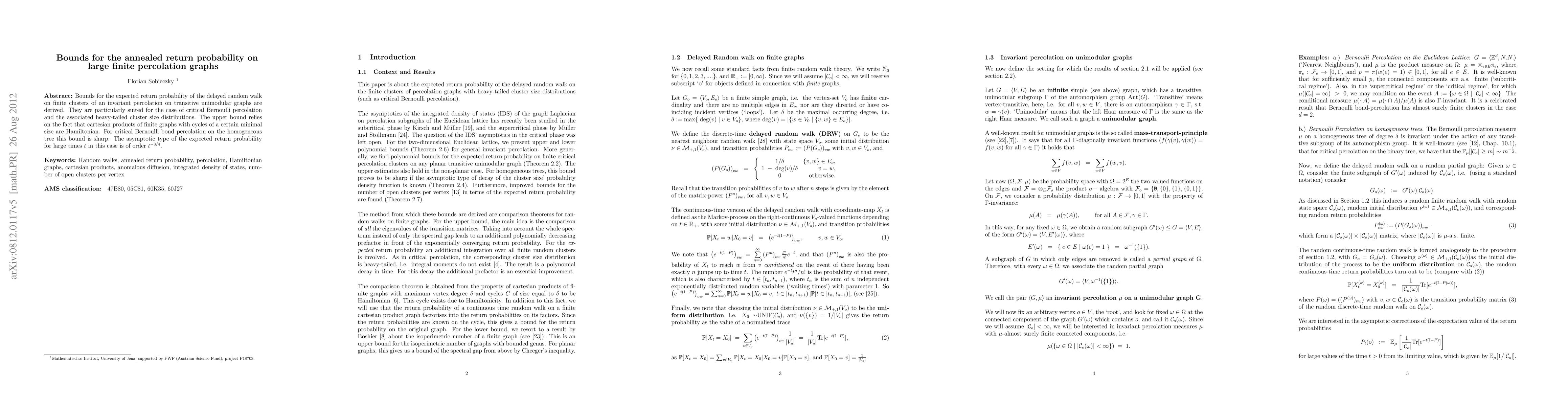 Bounds for the expected return probability of the delayed random walk on finite clusters of an invariant percolation on transitive unimodular graphs are derived. They are particularly suited for the case of critical Bernoulli percolation and the associated heavy-tailed cluster size distributions. The upper bound relies on the fact that cartesian products of finite graphs with cycles of a certain minimal size are Hamiltonian. For critical Bernoulli bond percolation on the homogeneous tree this bound is sharp. The asymptotic type of the expected return probability for large times t in this case is of order of the 3/4'th power of 1/t.