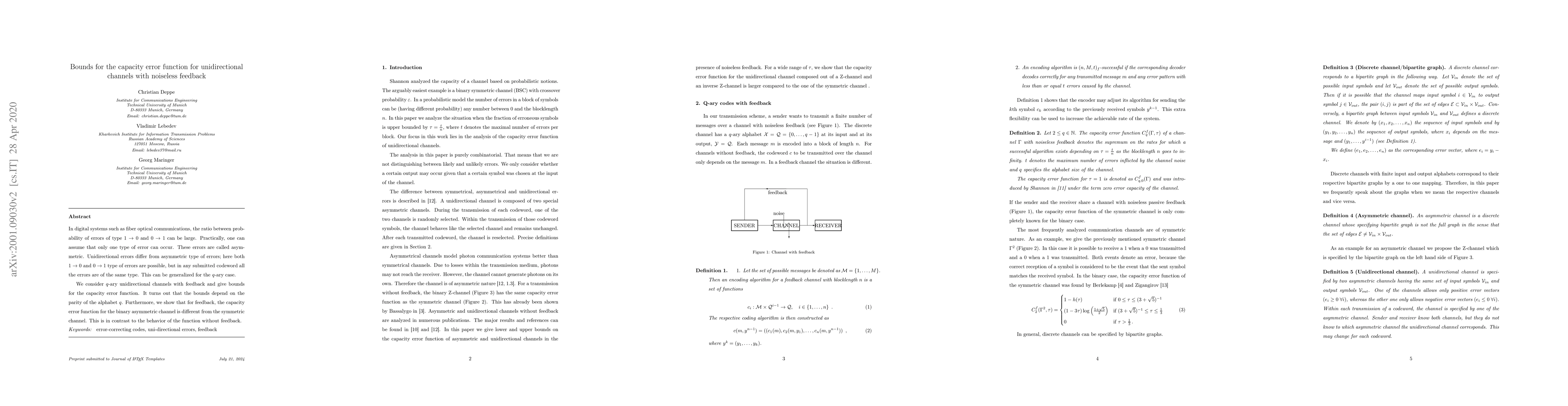 Researchers provide bounds for the capacity error function in unidirectional channels with noiseless feedback, highlighting that bounds depend on alphabet size parity and differ between symmetric and asymmetric channels.