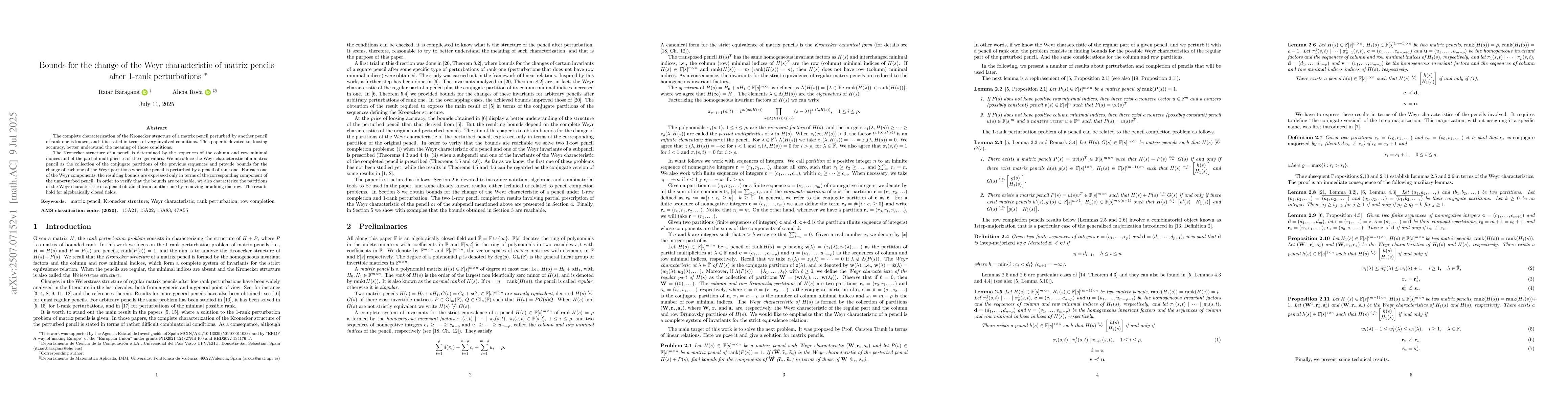 The paper introduces the concept of the Weyr characteristic of a matrix pencil and provides novel bounds for its changes under 1-rank perturbations, expressed in terms of the unperturbed pencil's components.