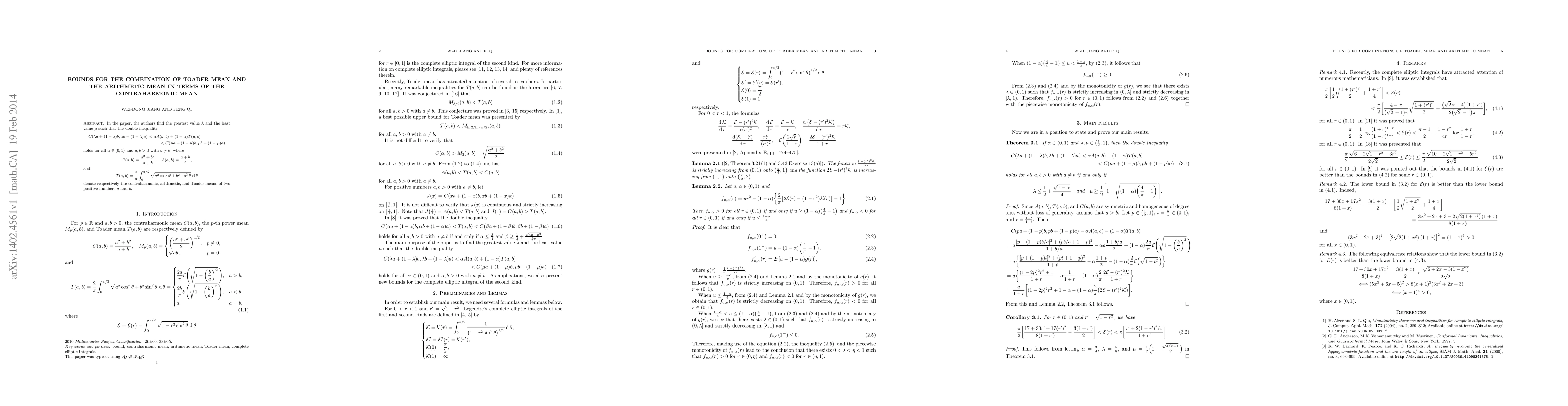The paper determines the bounds $\lambda$ and $\mu$ for the inequality involving the combination of the Toader mean and the arithmetic mean in terms of the contraharmonic mean for all $\alpha \in (0,1)$ and $a, b > 0$ with $a \neq b$. The means involved are the contraharmonic, arithmetic, and Toader means.