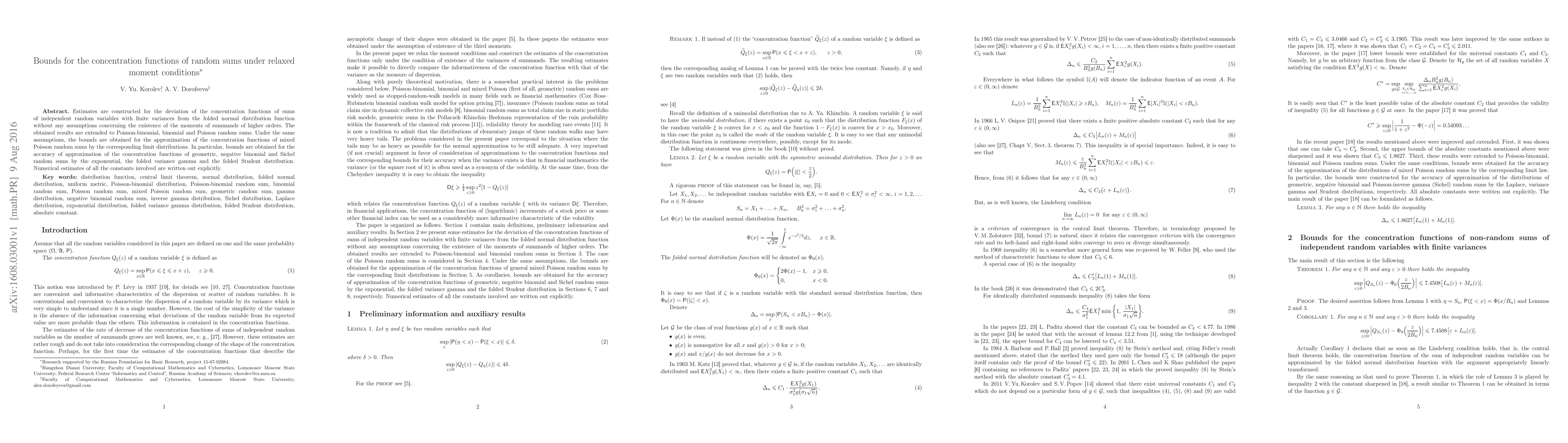 This paper constructs bounds for the concentration functions of various random sums (Poisson-binomial, binomial, Poisson, geometric, negative binomial, and Sichel) under relaxed moment conditions, showing their deviation from folded normal distributions without higher-order moment assumptions. Numerical estimates for these bounds are provided explicitly.