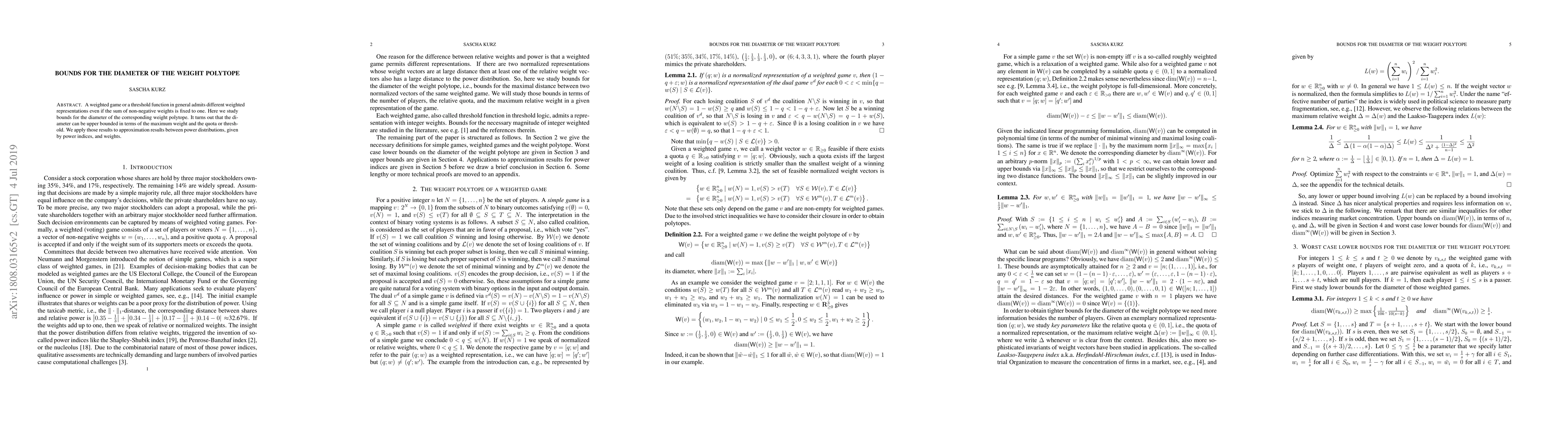 This paper investigates the diameter bounds for the weight polytope associated with weighted games, showing that the diameter can be upper bounded by the maximum weight and the quota or threshold. The findings are applied to approximation results between power distributions and weights.