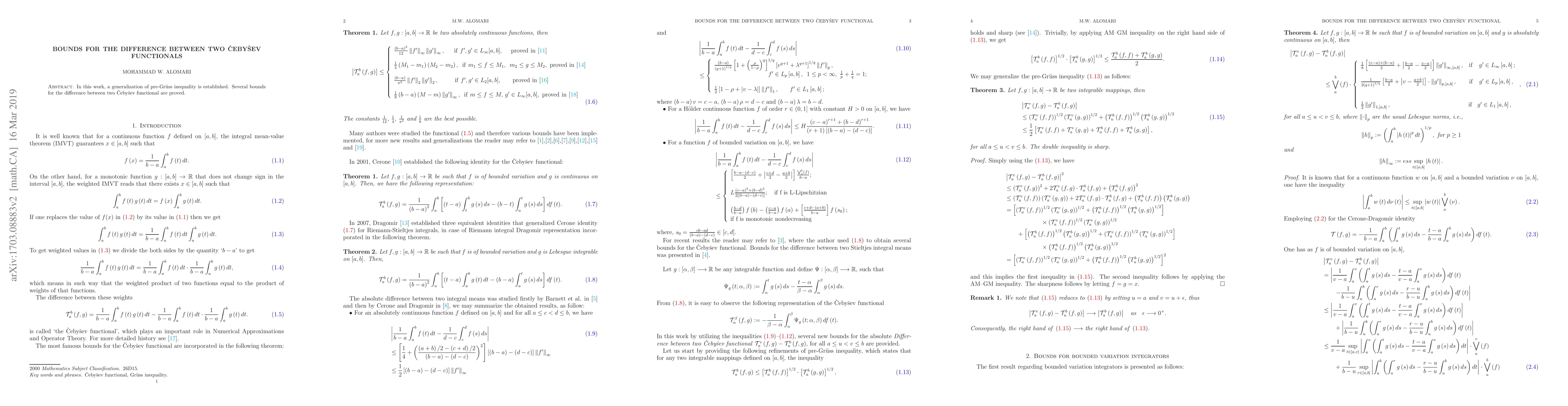 This paper establishes a generalized pre-Gruß inequality and provides several bounds for the difference between two Čebyšev functionals. The results contribute to the understanding of inequalities involving these functionals.