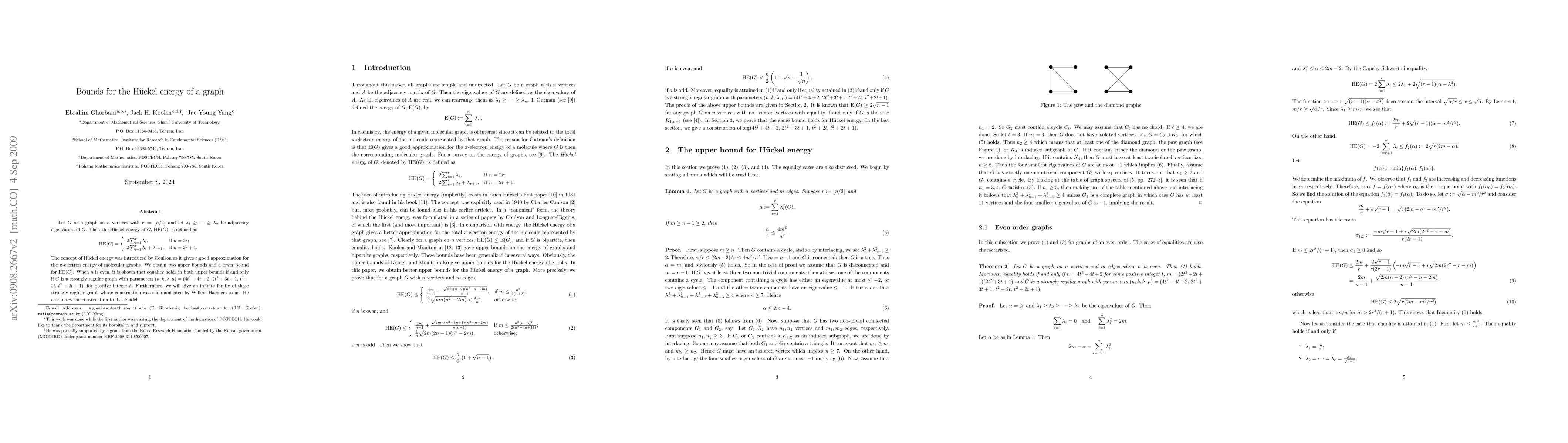 Let $G$ be a graph on $n$ vertices with $r := \lfloor n/2 \rfloor$ and let $\lambda_1 \geq...\geq \lambda_{n} $ be adjacency eigenvalues of $G$. Then the H\"uckel energy of $G$, HE($G$), is defined as $$\he(G) = {ll} 2\sum_{i=1}^{r} \lambda_i, & \hbox{if $n= 2r$;} 2\sum_{i=1}^{r} \lambda_i + \lambda_{r+1}, & \hbox{if $n= 2r+1$.} $$ The concept of H\"uckel energy was introduced by Coulson as it gives a good approximation for the $\pi$-electron energy of molecular graphs. We obtain two upper bounds and a lower bound for HE$(G)$. When $n$ is even, it is shown that equality holds in both upper bounds if and only if $G$ is a strongly regular graph with parameters $(n, k, \lambda, \mu) = (4t^2 +4t +2, 2t^2 +3t +1, t^2 +2t, t^2 + 2t +1),$ for positive integer $t$. Furthermore, we will give an infinite family of these strongly regular graph whose construction was communicated by Willem Haemers to us. He attributes the construction to J.J. Seidel.