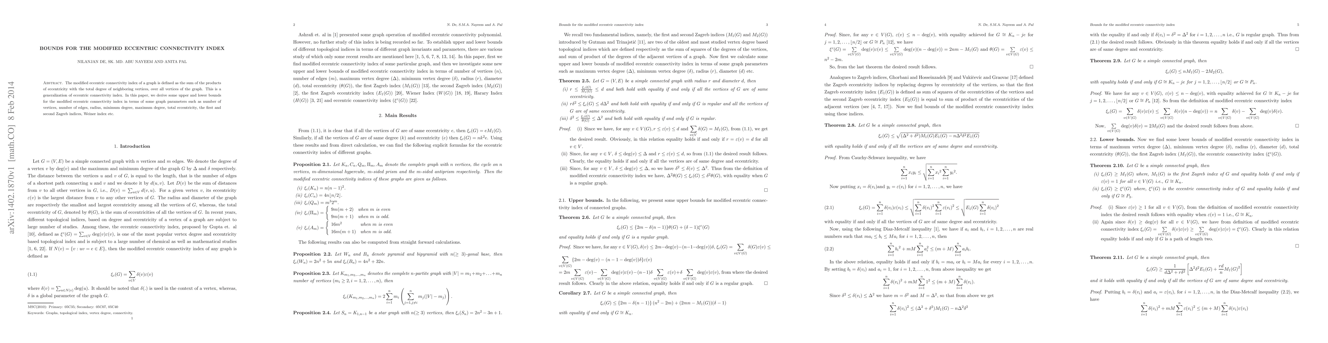 This paper derives upper and lower bounds for the modified eccentric connectivity index of a graph, a generalization of the eccentric connectivity index, in relation to various graph parameters including vertex count, edge count, radius, degree measures, and other indices like the Zagreb and Wiener indices.