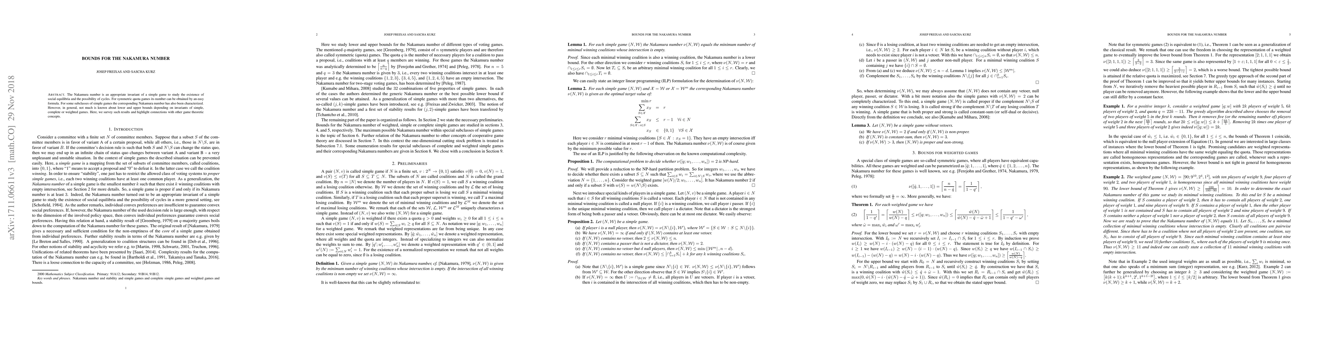 This paper investigates bounds for the Nakamura number, a game-theoretic concept used to study social equilibria and cycles in simple games. It highlights connections with other game theoretic concepts and provides new insights into lower and upper bounds depending on invariants of complete or weighted games.
