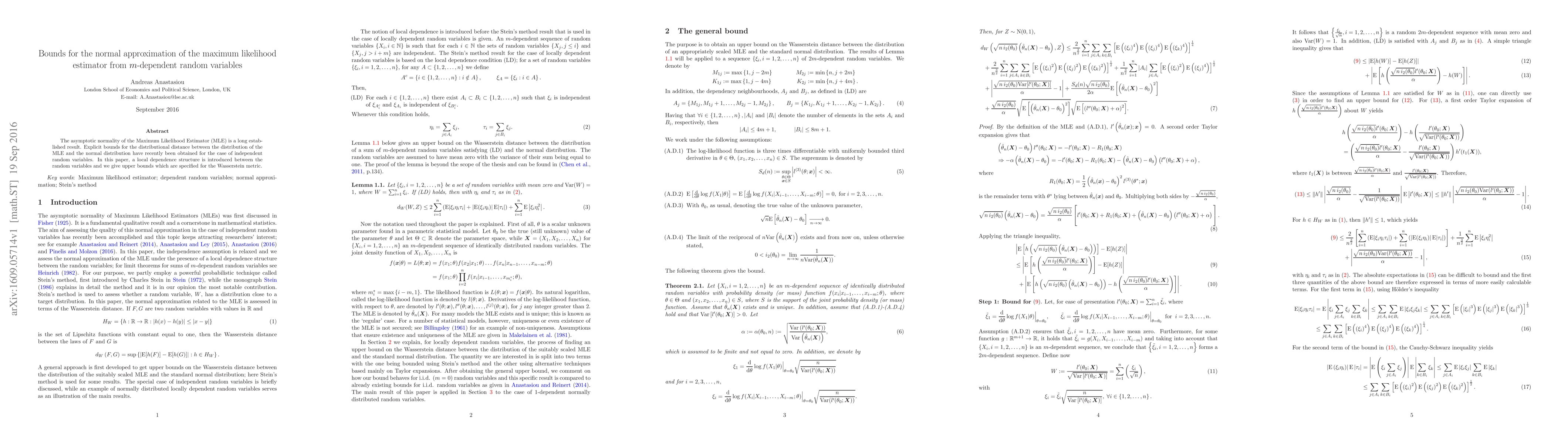 This paper establishes upper bounds for the normal approximation of the Maximum Likelihood Estimator (MLE) when the random variables exhibit m-dependence, extending previous results for independent variables using the Wasserstein metric to quantify distributional distance.
