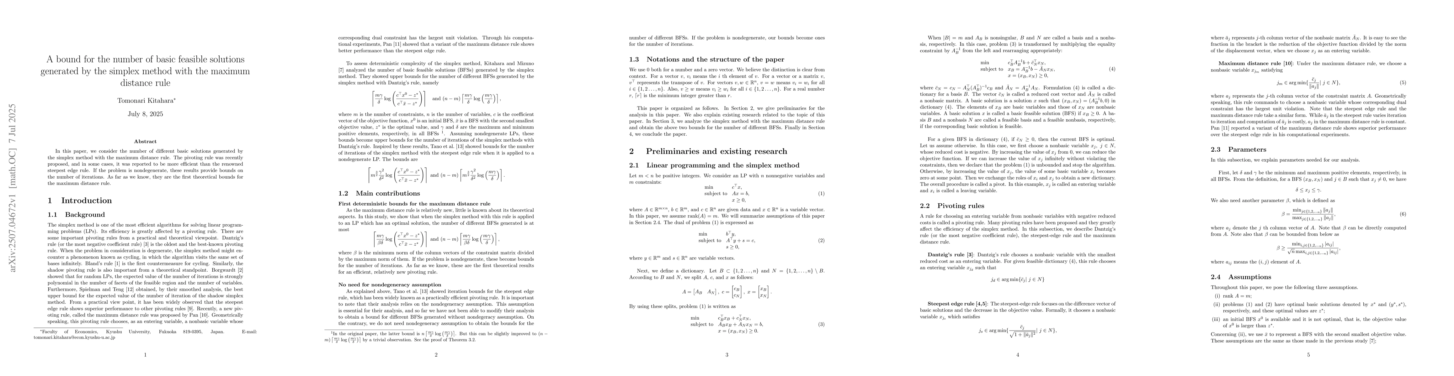 In this paper, we show bounds for the number of different basic solutions generated by the simplex method with the maximum distance rule. The pivoting rule was recently proposed, and in some cases, it was reported to be more efficient than the renowned steepest edge rule. If the problem is nondegenerate, these results provide bounds on the number of iterations. As far as we know, they are the first theoretical bounds for the maximum distance rule.