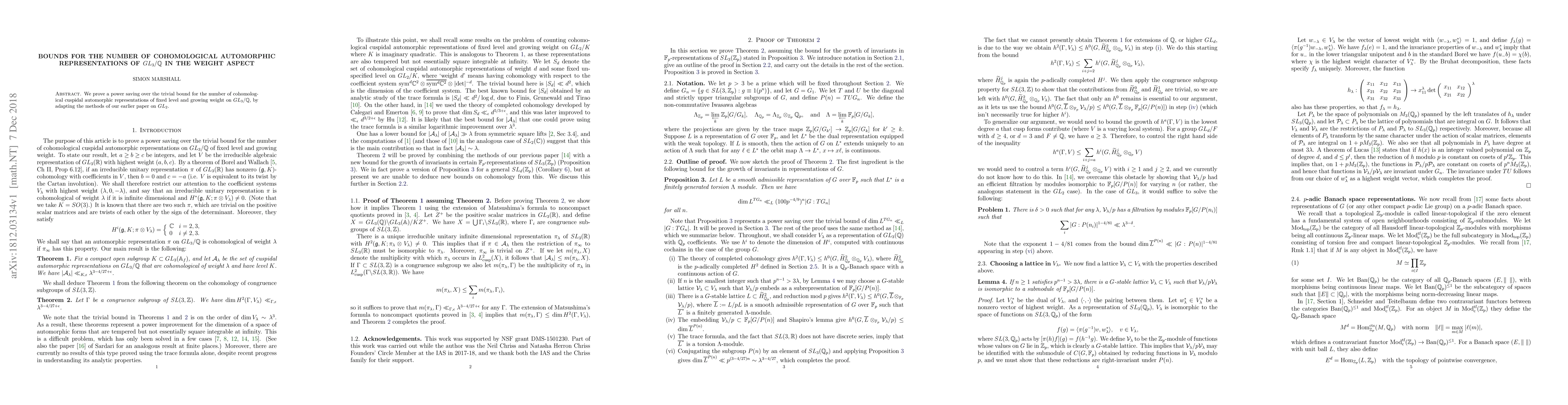 We prove a power saving over the trivial bound for the number of cohomological cuspidal automorphic representations of fixed level and growing weight on $GL_3/\mathbb{Q}$, by adapting the methods of our earlier paper on $GL_2$.