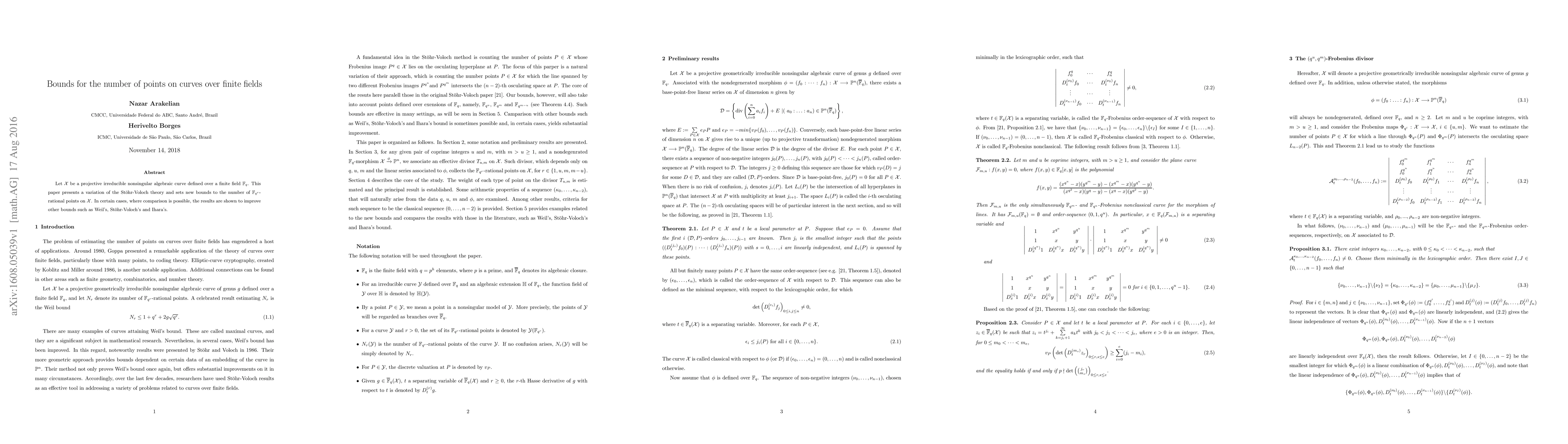 Let $\mathcal{X}$ be a projective irreducible nonsingular algebraic curve defined over a finite field $\mathbb{F}_q$. This paper presents a variation of the St\"orh-Voloch theory and sets new bounds to the number of $\mathbb{F}_{q^r}$-rational points on $\mathcal{X}$. In certain cases, where comparison is possible, the results are shown to improve other bounds such as Weil's, St\"orh-Voloch's and Ihara's.