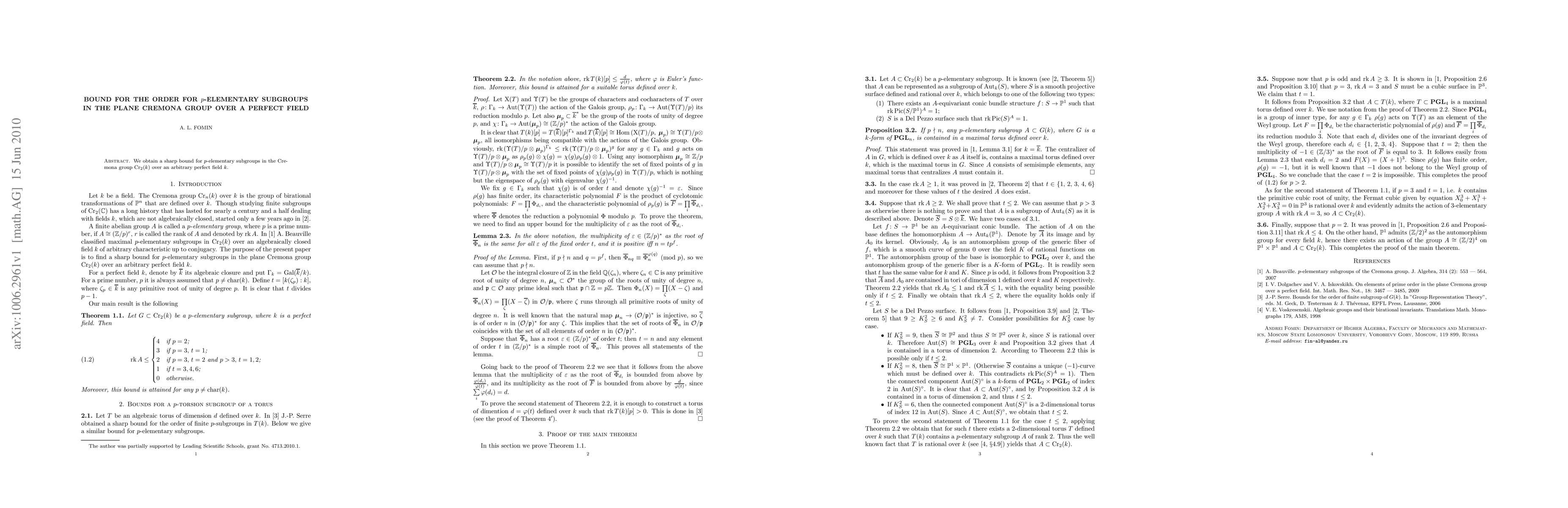 Summary: This paper establishes a precise upper limit for the order of p-elementary subgroups in the plane Cremona group over any perfect field, providing a significant contribution to the understanding of these algebraic structures.