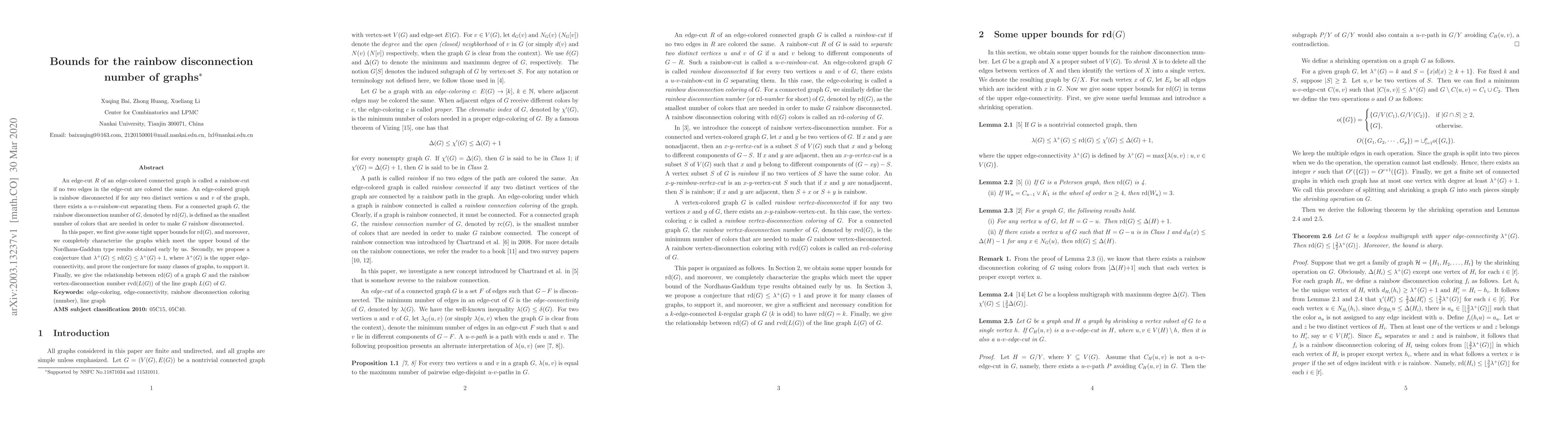 This paper explores bounds for the rainbow disconnection number, rd$(G)$, in edge-colored connected graphs, providing tight upper bounds and characterizing graphs meeting these bounds. It proposes a conjecture relating rd$(G)$ to the upper edge-connectivity, $\lambda^+(G)$, and supports it for various graph classes.