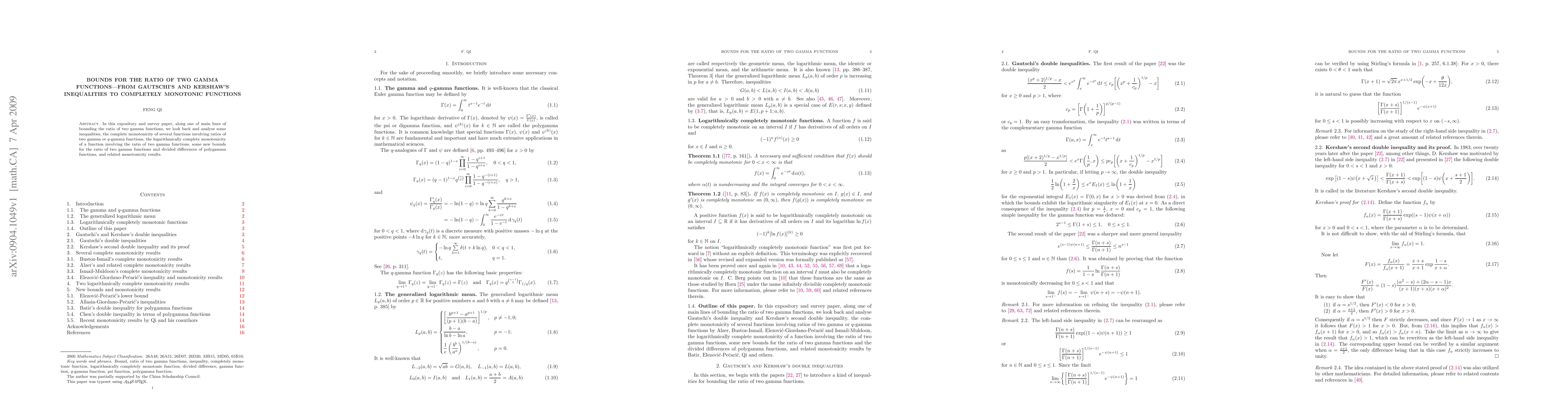 In this expository and survey paper, along one of main lines of bounding the ratio of two gamma functions, we look back and analyse some inequalities, the complete monotonicity of several functions involving ratios of two gamma or $q$-gamma functions, the logarithmically complete monotonicity of a function involving the ratio of two gamma functions, some new bounds for the ratio of two gamma functions and divided differences of polygamma functions, and related monotonicity results.