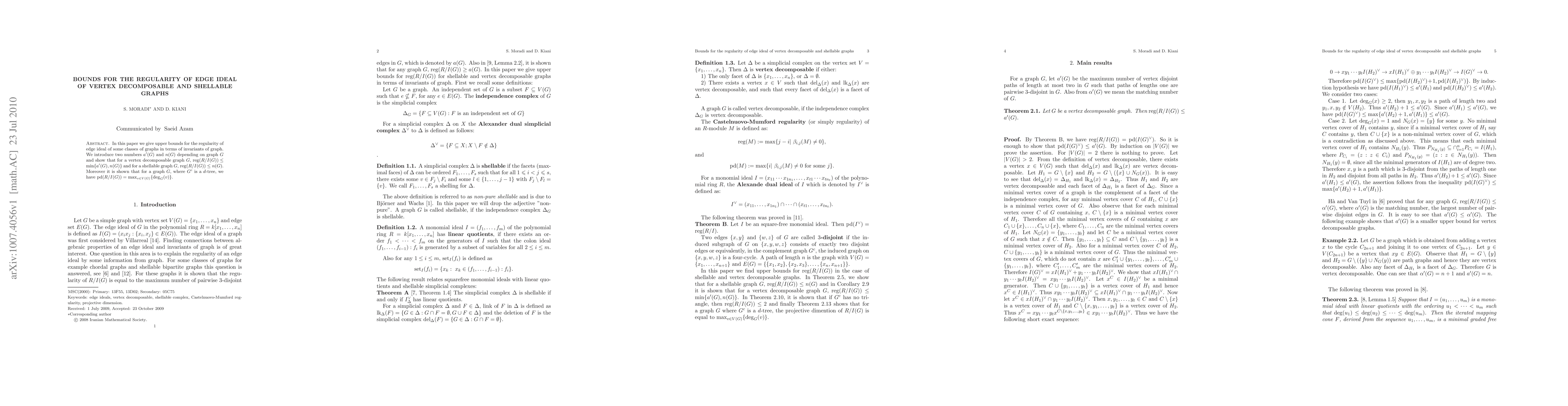 This paper establishes upper bounds for the regularity of edge ideals of vertex decomposable and shellable graphs, showing $\reg(R/I(G))\leq \min\{a'(G),n(G)\}$ for vertex decomposable graphs and $\reg(R/I(G))\leq n(G)$ for shellable graphs, while also linking the projective dimension of the edge ideal to the degrees of vertices in the complement of the graph.