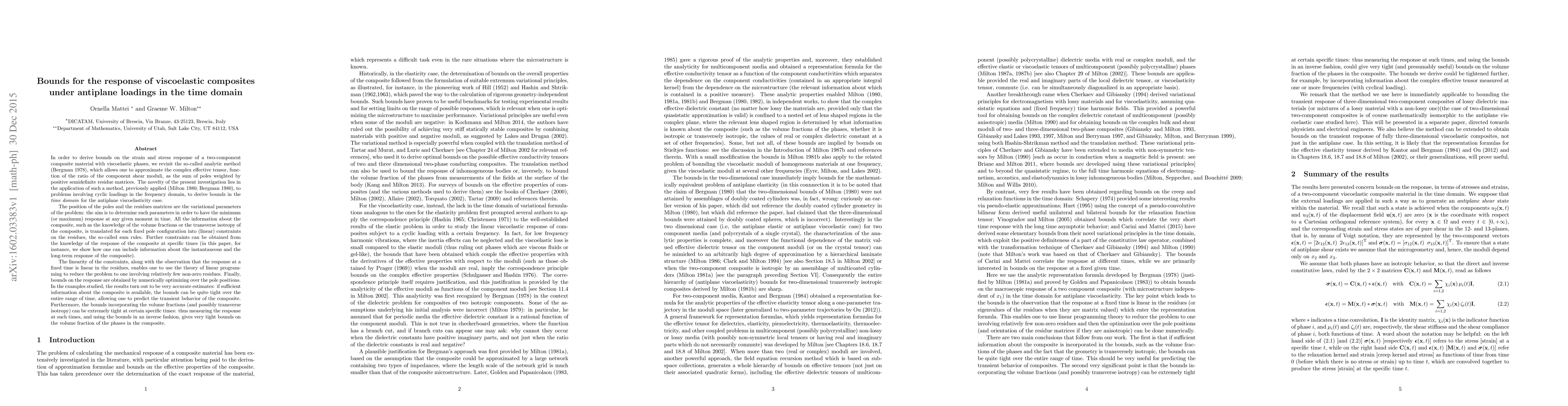 To derive bounds on the strain and stress response of a two-component composite material with viscoelastic phases, we revisit the so-called analytic method (Bergman 1978), which allows one to approximate the complex effective tensor, function of the ratio of the component shear moduli, as the sum of poles weighted by positive semidefinite residue matrices. The novelty of this investigation lies in the application of such a method, previously applied (Milton 1980; Bergman 1980) to problems involving cyclic loadings in the frequency domain, to derive bounds in the time domain for the antiplane viscoelasticity case. The position of the poles and the residues matrices are the variational parameters of the problem: the aim is to determine such parameters in order to have the minimum (or maximum) response at any given moment in time. All the information about the composite is translated for each fixed pole configuration into constraints on the residues, the so-called sum rules. The linearity of the constraints, along with the observation that the response at a fixed time is linear in the residues, enables one to use the theory of linear programming to reduce the problem to one involving relatively few non-zero residues. Finally, bounds on the response are obtained by numerically optimizing over the pole positions. In the examples studied, the results turn out to be very accurate estimates: if sufficient information about the composite is available, the bounds can be quite tight over the entire range of time, allowing one to predict the transient behavior of the composite. Furthermore, the bounds incorporating the volume fractions (and possibly transverse isotropy) can be extremely tight at certain specific times.