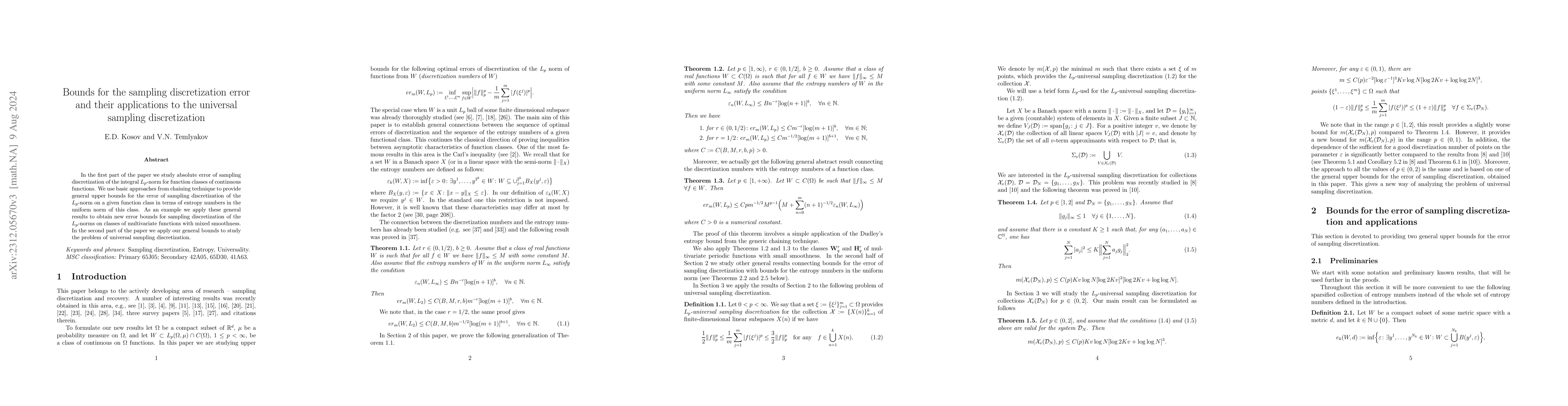 This paper establishes bounds for the sampling discretization error of $L_p$-norms for continuous functions, using chaining techniques and entropy numbers. It also explores universal sampling discretization and optimal sampling recovery methods.