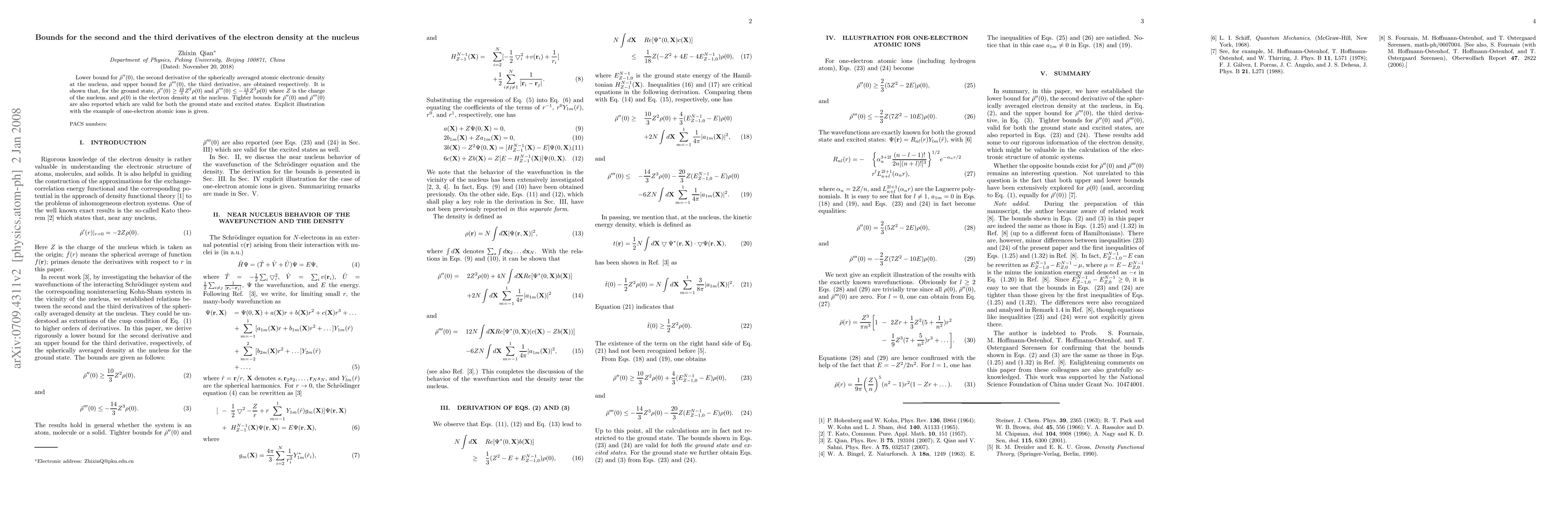 Lower bound for ${\bar \rho}''(0)$, the second derivative of the spherically averaged atomic electronic density at the nucleus, and upper bound for ${\bar \rho}'''(0)$, the third derivative, are obtained respectively. It is shown that, for the ground state, ${\bar \rho}''(0) \ge {10/3} Z^2 \rho(0)$ and ${\bar \rho}'''(0) \le -{14/3}Z^3 \rho(0)$ where $Z$ is the charge of the nucleus, and $\rho(0)$ is the electron density at the nucleus. Tighter bounds for ${\bar \rho}''(0)$ and ${\bar \rho}'''(0)$ are also reported which are valid for both the ground state and excited states. Explicit illustration with the example of one-electron atomic ions is given.