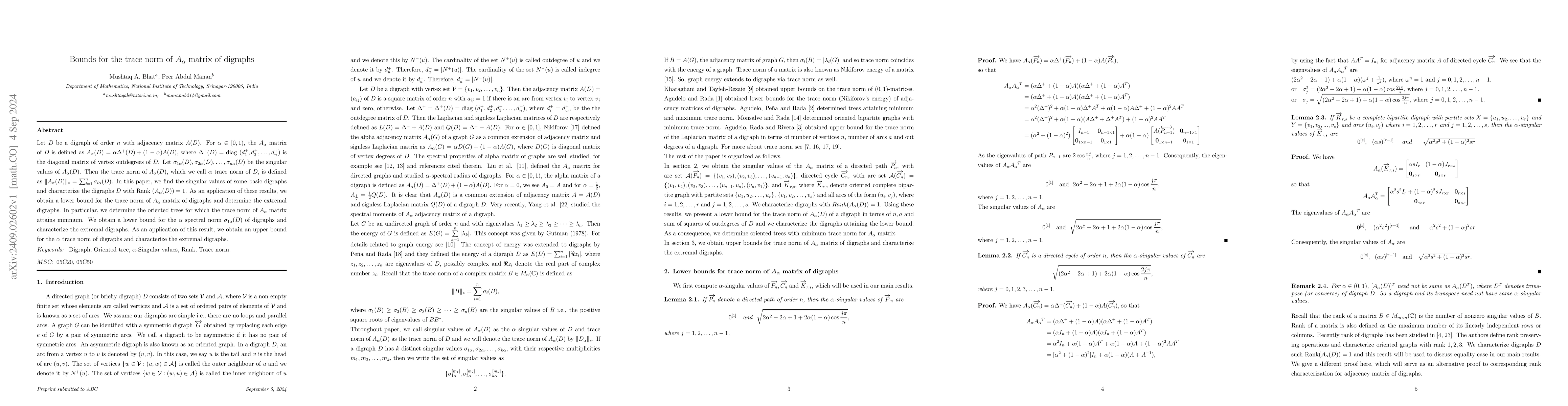 Let $D$ be a digraph of order $n$ with adjacency matrix $A(D)$. For $\alpha\in[0,1)$, the $A_{\alpha}$ matrix of $D$ is defined as $A_{\alpha}(D)=\alpha {\Delta}^{+}(D)+(1-\alpha)A(D)$, where ${\Delta}^{+}(D)=\mbox{diag}~(d_1^{+},d_2^{+},\dots,d_n^{+})$ is the diagonal matrix of vertex outdegrees of $D$. Let $\sigma_{1\alpha}(D),\sigma_{2\alpha}(D),\dots,\sigma_{n\alpha}(D)$ be the singular values of $A_{\alpha}(D)$. Then the trace norm of $A_{\alpha}(D)$, which we call $\alpha$ trace norm of $D$, is defined as $\|A_{\alpha}(D)\|_*=\sum_{i=1}^{n}\sigma_{i\alpha}(D)$. In this paper, we find the singular values of some basic digraphs and characterize the digraphs $D$ with $\mbox{Rank}~(A_{\alpha}(D))=1$. As an application of these results, we obtain a lower bound for the trace norm of $A_{\alpha}$ matrix of digraphs and determine the extremal digraphs. In particular, we determine the oriented trees for which the trace norm of $A_{\alpha}$ matrix attains minimum. We obtain a lower bound for the $\alpha$ spectral norm $\sigma_{1\alpha}(D)$ of digraphs and characterize the extremal digraphs. As an application of this result, we obtain an upper bound for the $\alpha$ trace norm of digraphs and characterize the extremal digraphs.