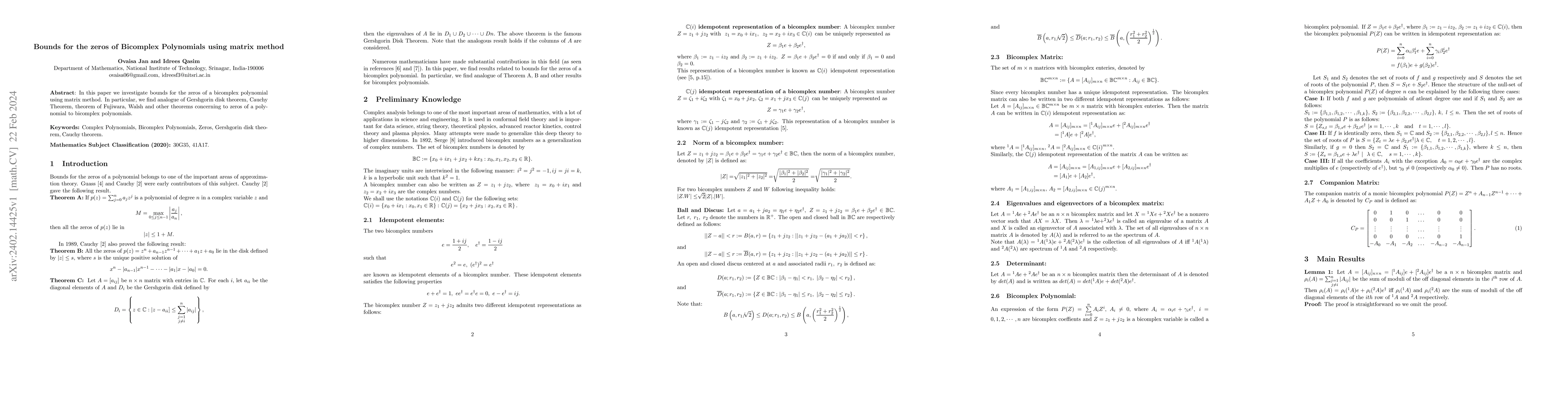 Summary: This research develops matrix-based methods to establish bounds for the zeros of bicomplex polynomials, extending classical theorems like Gershgorin’s disk theorem to this new mathematical domain. The study aims to provide analogues of several well-known polynomial zero theorems for bicomplex polynomials.