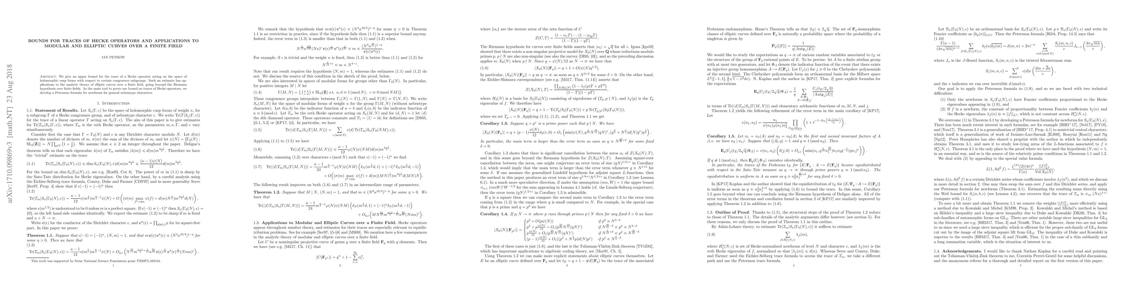 Summary: This paper establishes an upper bound for the trace of Hecke operators on holomorphic cusp forms, utilizing a new Petersson formula for newforms. The result has implications for the analytic theory of elliptic curves over finite fields, extending beyond the Riemann hypothesis in this context.