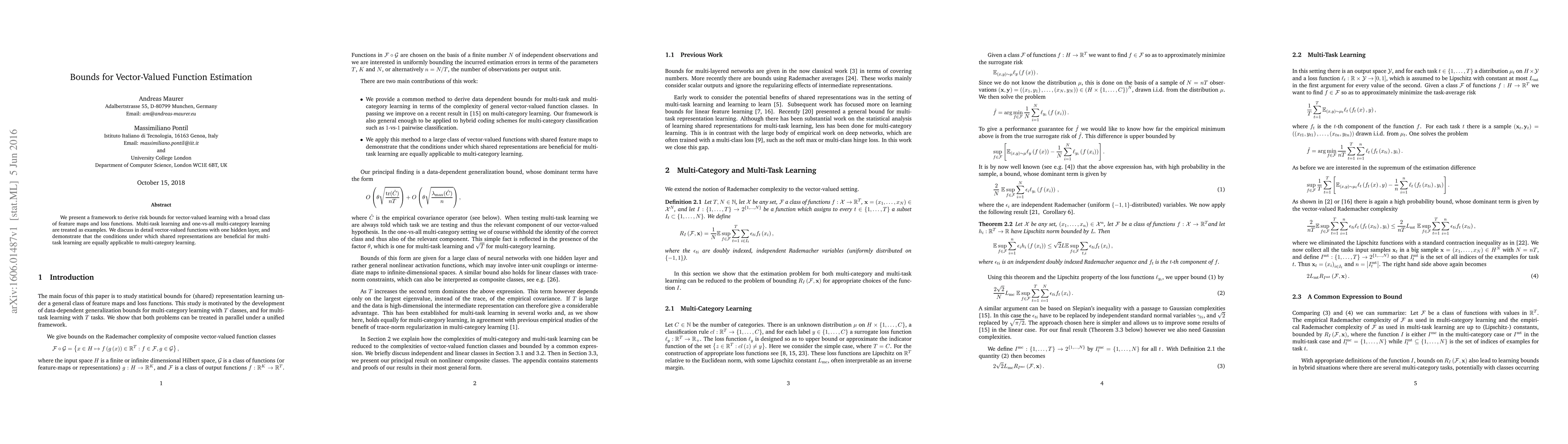 We present a framework to derive risk bounds for vector-valued learning with a broad class of feature maps and loss functions. Multi-task learning and one-vs-all multi-category learning are treated as examples. We discuss in detail vector-valued functions with one hidden layer, and demonstrate that the conditions under which shared representations are beneficial for multi- task learning are equally applicable to multi-category learning.