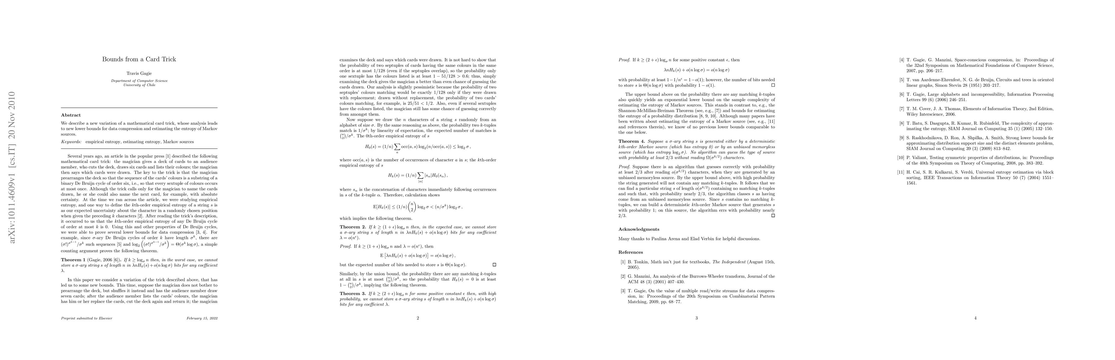 We describe a new variation of a mathematical card trick, whose analysis leads to new lower bounds for data compression and estimating the entropy of Markov sources.