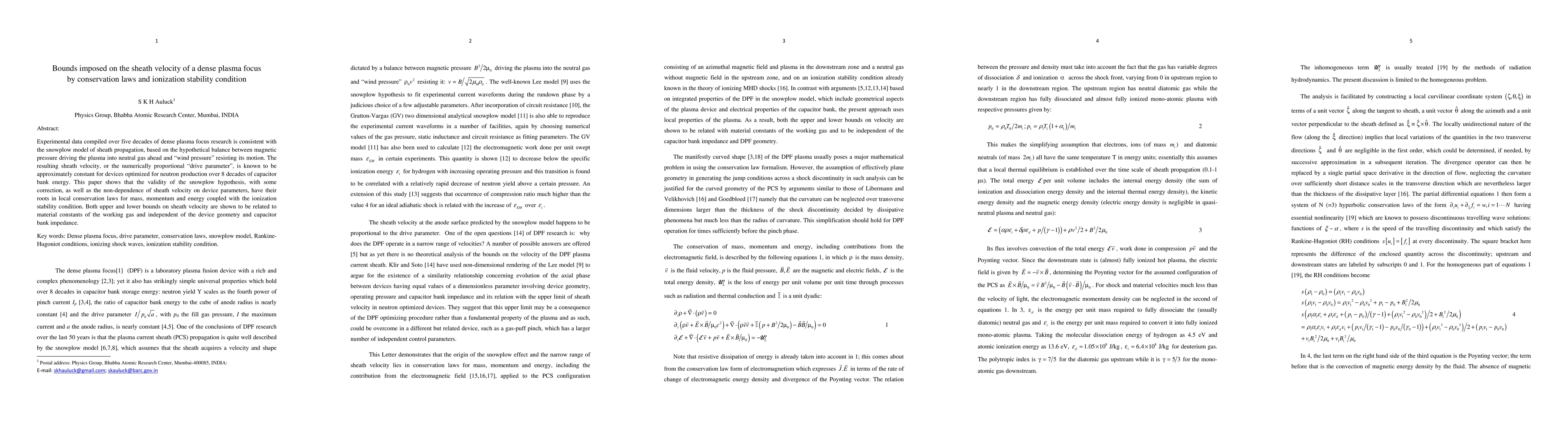 Experimental data compiled over five decades of dense plasma focus research is consistent with the snowplow model of sheath propagation, based on the hypothetical balance between magnetic pressure driving the plasma into neutral gas ahead and wind pressure resisting its motion. The resulting sheath velocity, or the numerically proportional drive parameter, is known to be approximately constant for devices optimized for neutron production over 8 decades of capacitor bank energy. This paper shows that the validity of the snowplow hypothesis, with some correction, as well as the non-dependence of sheath velocity on device parameters, have their roots in local conservation laws for mass, momentum and energy coupled with the ionization stability condition. Both upper and lower bounds on sheath velocity are shown to be related to material constants of the working gas and independent of the device geometry and capacitor bank impedance.