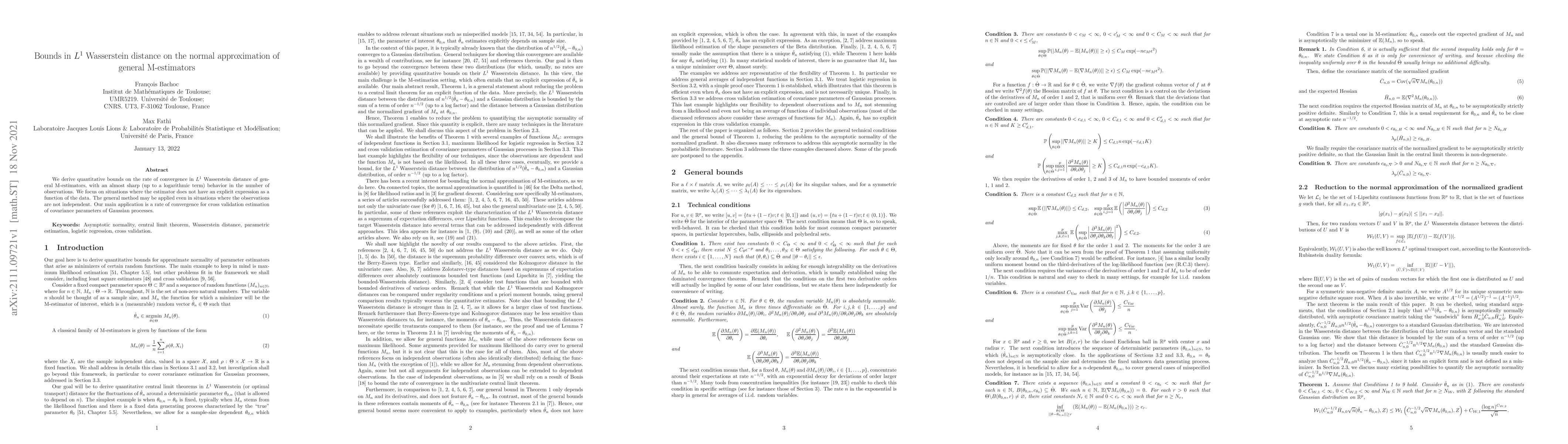 We derive quantitative bounds on the rate of convergence in $L^1$ Wasserstein distance of general M-estimators, with an almost sharp (up to a logarithmic term) behavior in the number of observations. We focus on situations where the estimator does not have an explicit expression as a function of the data. The general method may be applied even in situations where the observations are not independent. Our main application is a rate of convergence for cross validation estimation of covariance parameters of Gaussian processes.