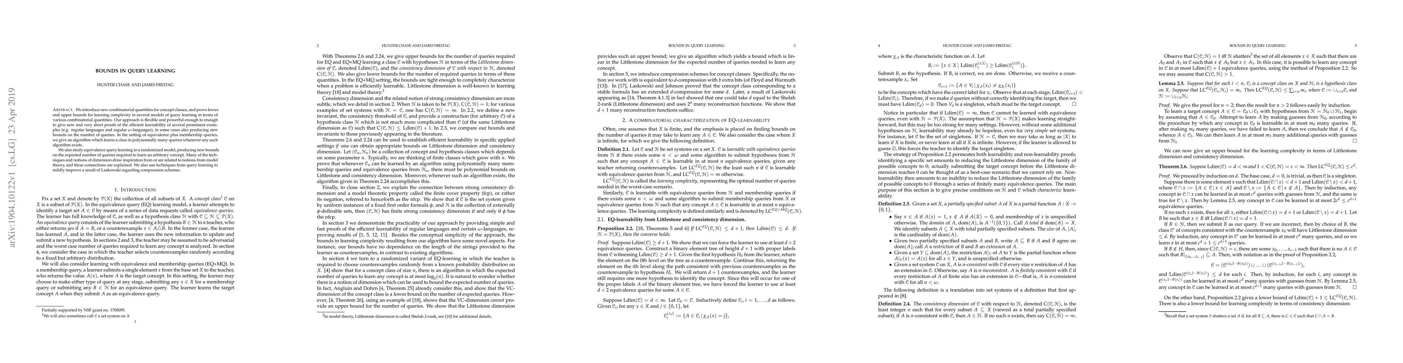 This paper introduces new combinatorial measures for concept classes and establishes both lower and upper bounds for query learning complexity. It provides efficient proofs for the learnability of several prominent examples and presents new algorithms and bounds for equivalence and membership query learning, drawing on techniques from model theory and improving existing compression schemes.