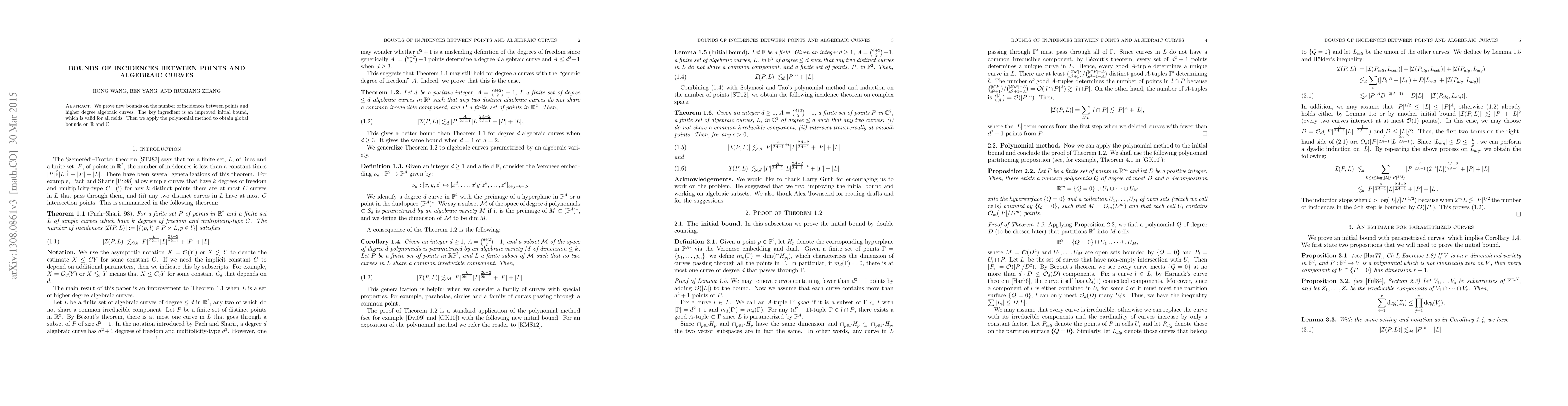 We prove new bounds on the number of incidences between points and higher degree algebraic curves. The key ingredient is an improved initial bound, which is valid for all fields. Then we apply the polynomial method to obtain global bounds on $\mathbb{R}$ and $\mathbb{C}$.