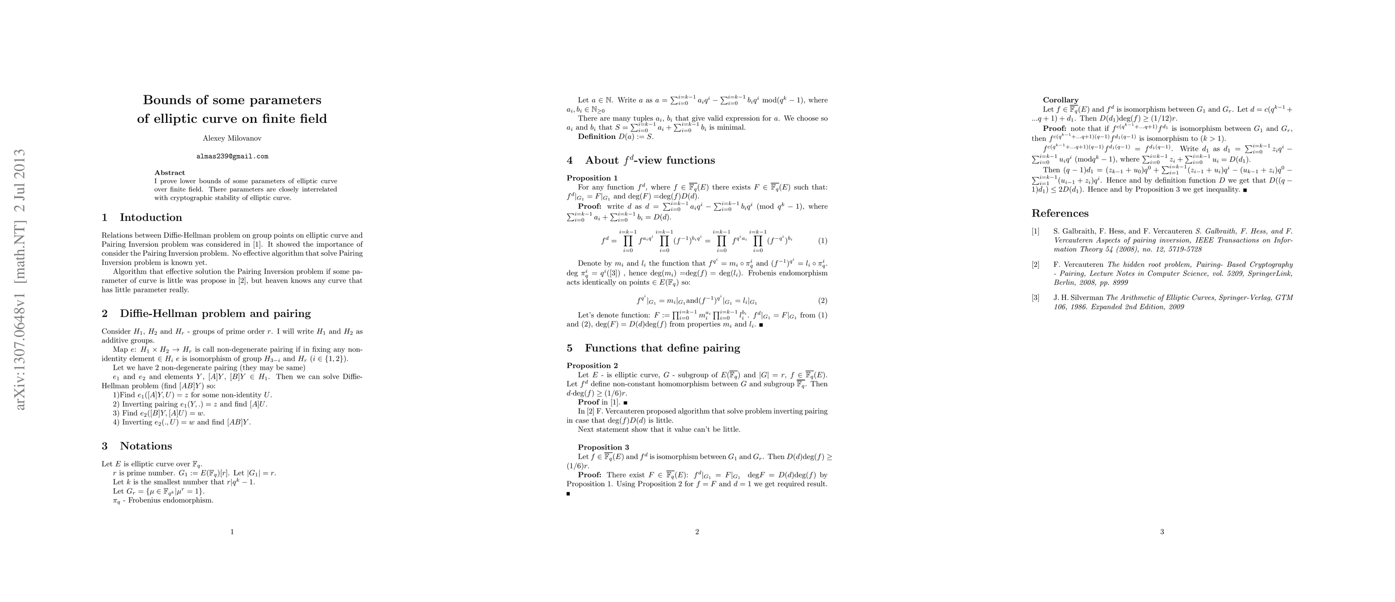 I prove lower bounds of some parameters of elliptic curve over finite field. There parameters are closely interrelated with cryptographic stability of elliptic curve.