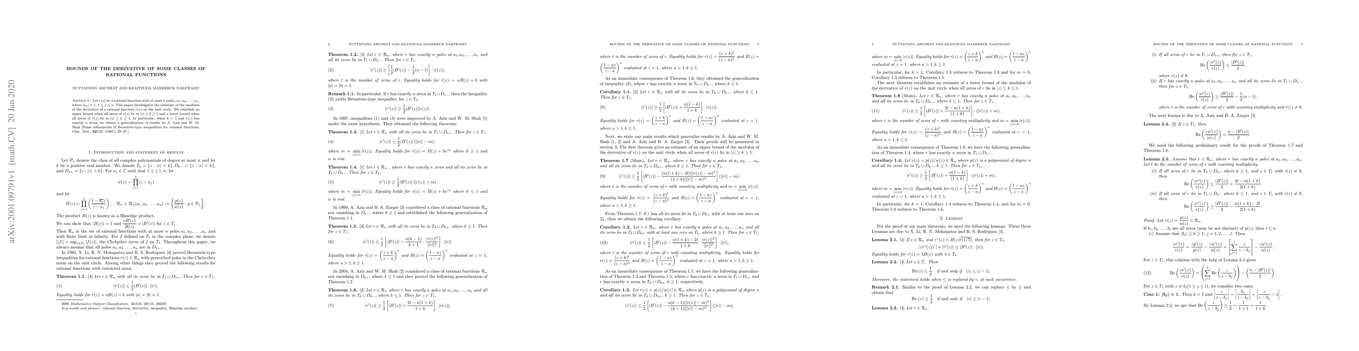 Let $r(z)$ be a rational function with at most $n$ poles, $a_1, a_2, \ldots, a_n,$ where $|a_j| > 1,$ $1\leq j\leq n.$ This paper investigates the estimate of the modulus of the derivative of a rational function $r(z)$ on the unit circle. We establish an upper bound when all zeros of $r(z)$ lie in $|z|\geq k\geq 1$ and a lower bound when all zeros of $r(z)$ lie in $|z|\leq k \leq 1.$ In particular, when $k=1$ and $r(z)$ has exactly $n$ zeros, we obtain a generalization of results by A. Aziz and W. M. Shah [Some refinements of Bernstein-type inequalities for rational functions, Glas. Mat., {\bf 32}(52) (1997), 29--37.].