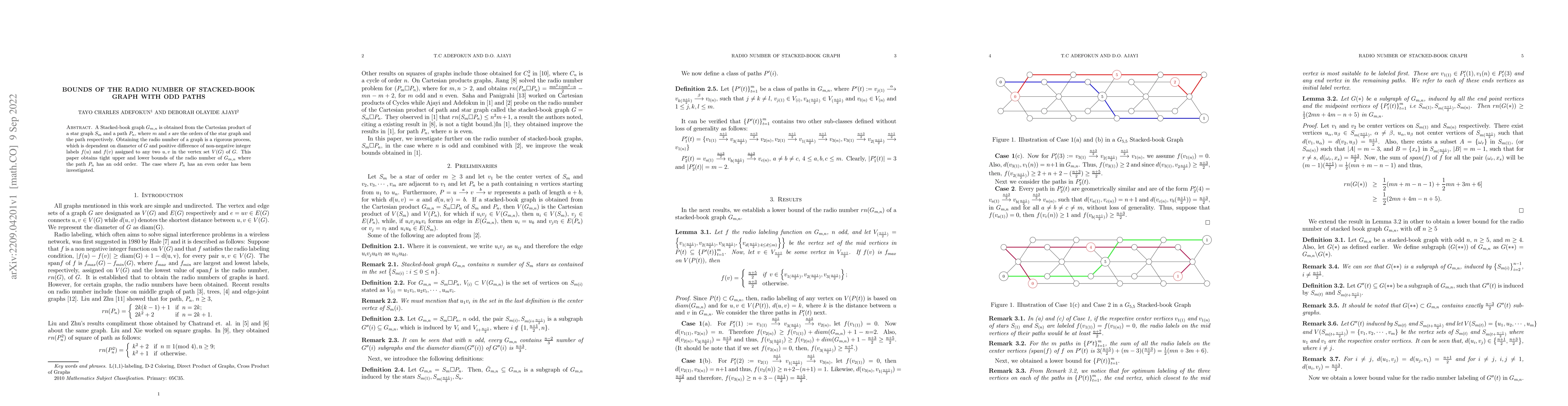 A Stacked-book graph Gm,n is obtained from the Cartesian product of a star graph Sm and a path Pn, where m and s are the orders of the star graph and the path respectively. Obtaining the radio number of a graph is a rigorous process, which is dependent on the diameter of G and positive difference of non-negative integer labels f(u) and f(v) assigned to any two u, v in the vertex set V (G) of G. This paper obtains tight upper and lower bounds of the radio number of Gm,n where the path Pn has an odd order. The case where Pn has an even order has been investigated.