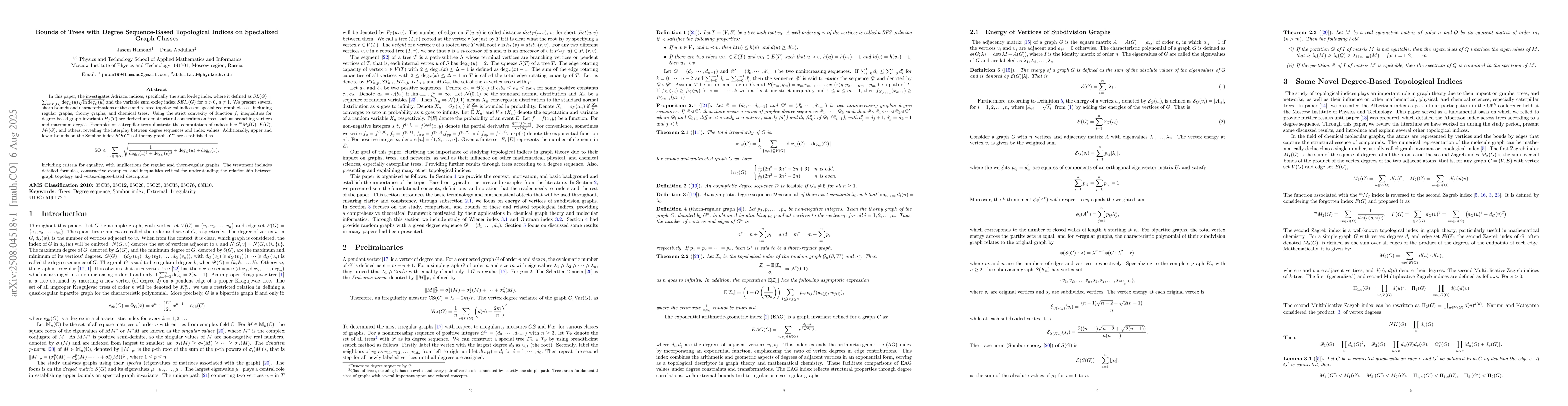 In this paper, the investigates Adriatic indices, specifically the sum lordeg index where it defined as $SL(G) = \sum_{u \in V(G)} \deg_G(u) \sqrt{\ln \deg_G(u)}$ and the variable sum exdeg index $SEI_a(G)$ for $a>0$, $a\neq 1$. We present several sharp bounds and characterizations of these and related topological indices on specialized graph classes, including regular graphs, thorny graphs, and chemical trees. Using the strict convexity of function $f$, inequalities for degree-based graph invariants $H_f(T)$ are derived under structural constraints on trees such as branching vertices and maximum degree. Examples on caterpillar trees illustrate the computation of indices like $^{m}M_2(G)$, $F(G)$, $M_2(G)$, and others, revealing the interplay between degree sequences and index values. Additionally, upper and lower bounds on the Sombor index $SO(G^*)$ of thorny graphs $G^*$ are established as \[ \operatorname{SO} \leqslant \sum_{uv\in E(G)}\sqrt{\frac{1}{\deg_{G}(u)^2+\deg_{G}(v)^2}+\deg_{G}(u)+\deg_{G}(v)}, \] including criteria for equality, with implications for regular and thorn-regular graphs. The treatment includes detailed formulas, constructive examples, and inequalities critical for understanding the relationship between graph topology and vertex-degree-based descriptors.