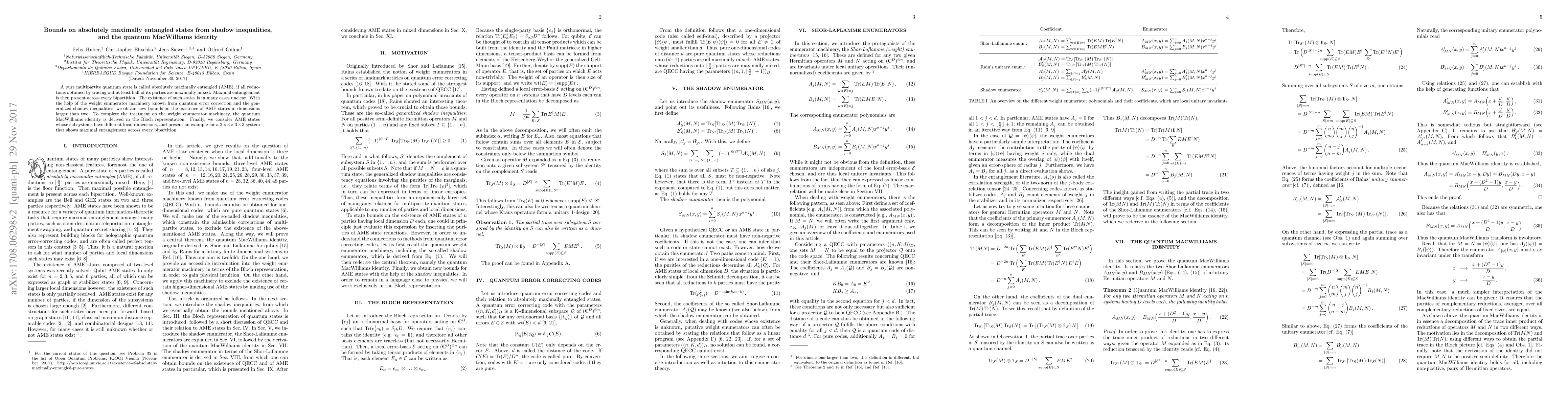 This paper establishes new bounds on the existence of absolutely maximally entangled (AME) states using shadow inequalities and the quantum MacWilliams identity. It also presents an example of a $2 \times 3 \times 3 \times 3$ system demonstrating maximal entanglement across every bipartition.