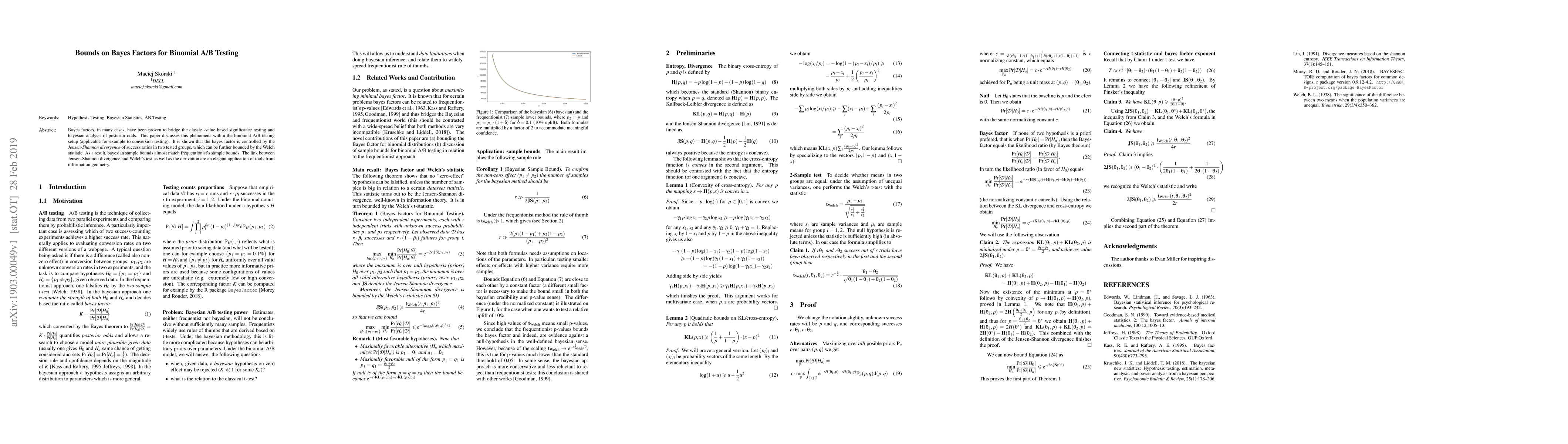 This paper explores the relationship between Bayes factors and traditional significance testing in binomial A/B testing, showing that the Bayes factor is bounded by the Jensen-Shannon divergence of success ratios, which is further constrained by the Welch statistic, thus aligning Bayesian and frequentist sample bounds.