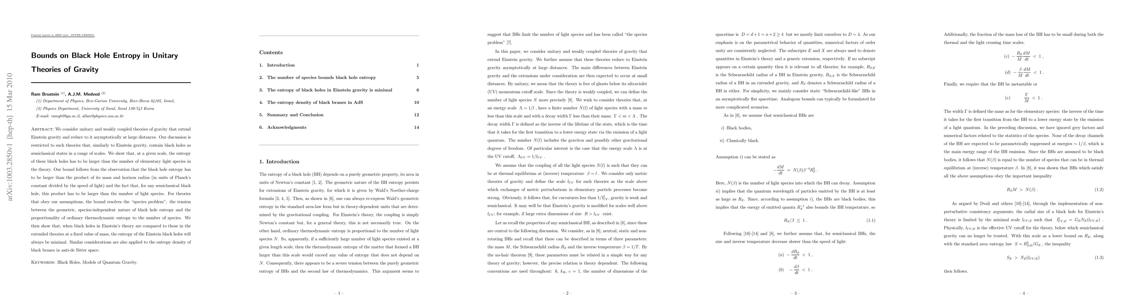 We consider unitary and weakly coupled theories of gravity that extend Einstein gravity and reduce to it asymptotically at large distances. Our discussion is restricted to such theories that, similarly to Einstein gravity, contain black holes as semiclassical states in a range of scales. We show that, at a given scale, the entropy of these black holes has to be larger than the number of elementary light species in the theory. Our bound follows from the observation that the black hole entropy has to be larger than the product of its mass and horizon radius (in units of Planck's constant divided by the speed of light) and the fact that, for any semiclassical black hole, this product has to be larger than the number of light species. For theories that obey our assumptions, the bound resolves the "species problem": the tension between the geometric, species-independent nature of black hole entropy and the proportionality of ordinary thermodynamic entropy to the number of species. We then show that, when black holes in Einstein's theory are compared to those in the extended theories at a fixed value of mass, the entropy of the Einstein black holes will always be minimal. Similar considerations are also applied to the entropy density of black branes in anti-de Sitter space.