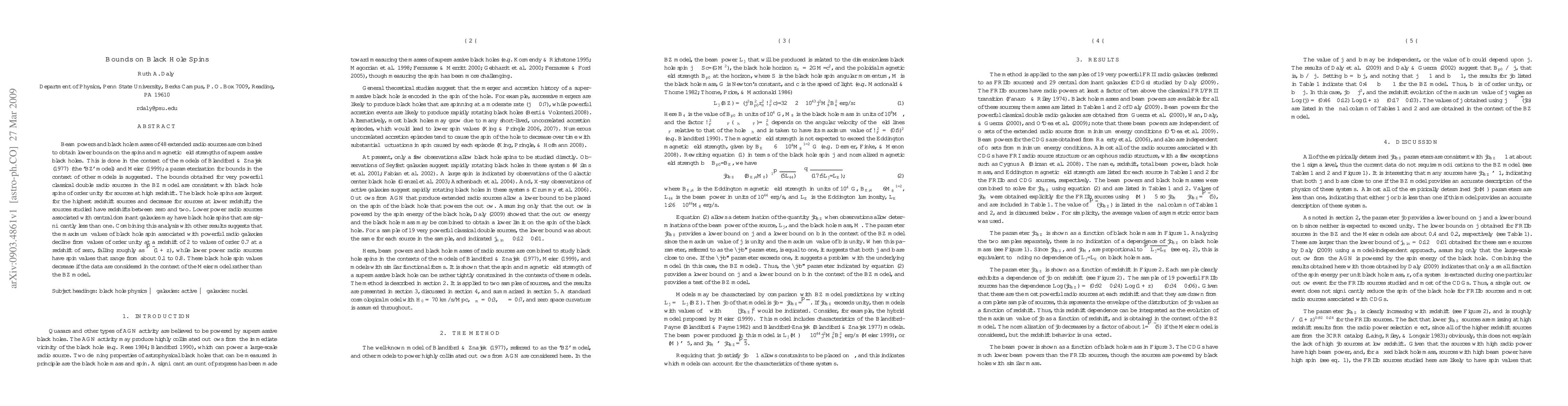 Beam powers and black hole masses of 48 extended radio sources are combined to obtain lower bounds on the spins and magnetic field strengths of supermassive black holes. This is done in the context of the models of Blandford & Znajek (1977) (the 'BZ' model) and Meier (1999); a parameterization for bounds in the context of other models is suggested. The bounds obtained for very powerful classical double radio sources in the BZ model are consistent with black hole spins of order unity for sources at high redshift. The black hole spins are largest for the highest redshift sources and decrease for sources at lower redshift; the sources studied have redshifts between zero and two. Lower power radio sources associated with central dominant galaxies may have black hole spins that are significantly less than one. Combining this analysis with other results suggests that the maximum values of black hole spin associated with powerful radio galaxies decline from values of order unity at a redshift of 2 to values of order 0.7 at a redshift of zero, while lower power radio sources have spin values that range from about 0.1 to 0.8. These black hole spin values decrease if the data are considered in the context of the Meier model rather than the BZ model.