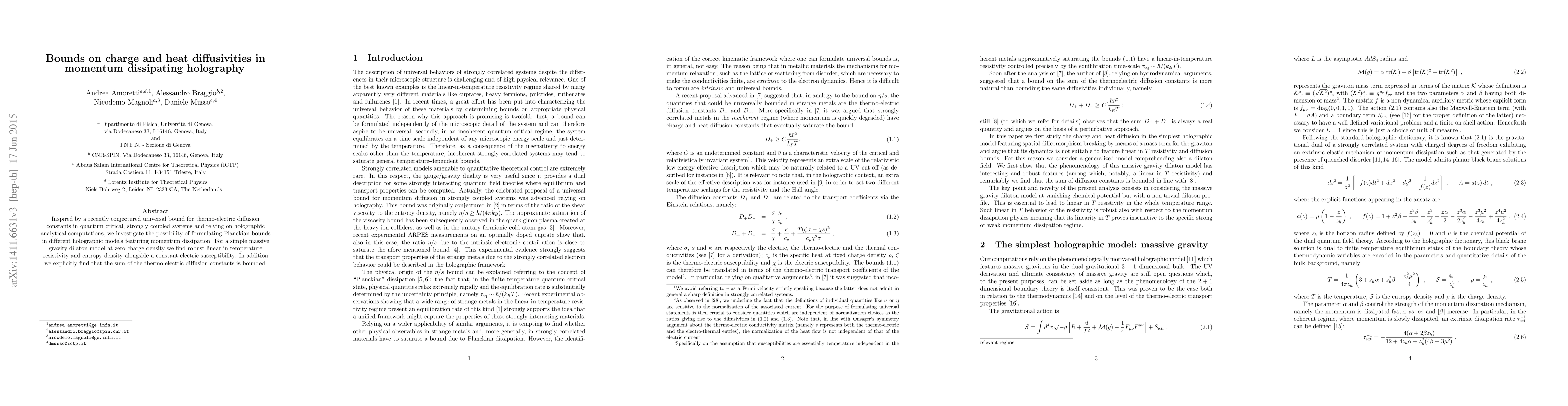 This paper explores Planckian bounds for charge and heat diffusivities in holographic models with momentum dissipation, finding robust linear resistivity and entropy density, and demonstrating a universal bound on the sum of thermo-electric diffusion constants.