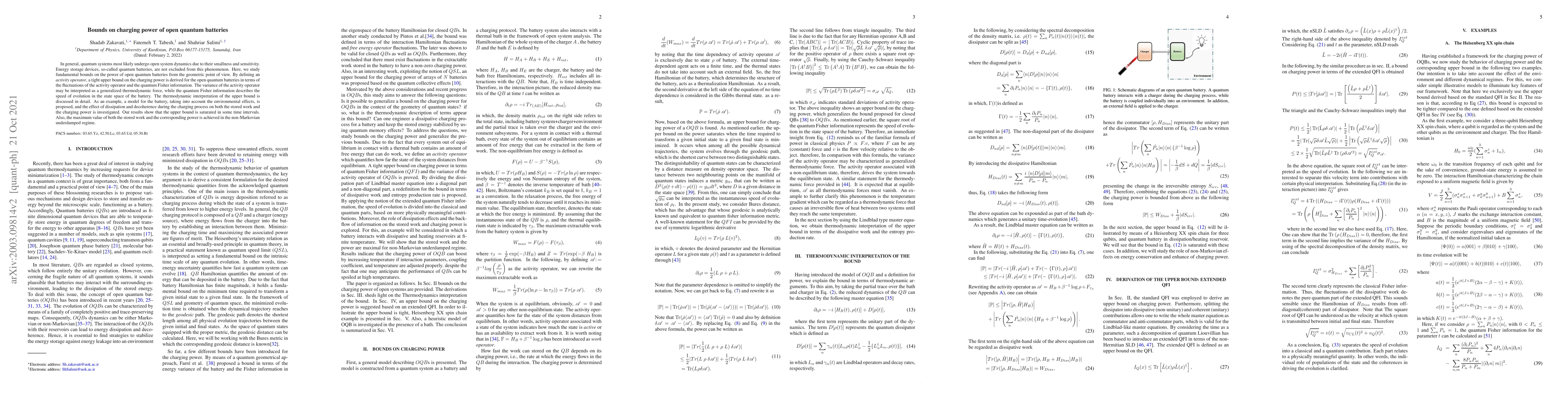 This paper derives fundamental bounds on the charging power of open quantum batteries using geometric methods, defining an activity operator to establish a tight upper bound linked to the activity operator's fluctuations and quantum Fisher information. The study also explores the impact of environmental effects and decoherence on the charging process, revealing that maximum stored work and power occur in the non-Markovian underdamped regime.