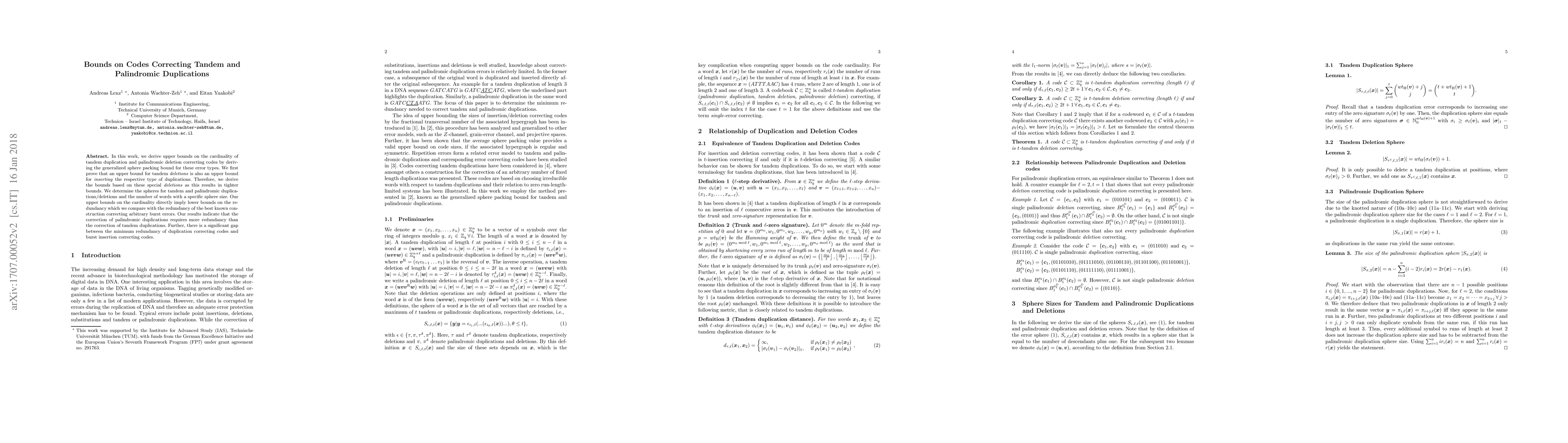 This paper establishes upper bounds on the size of error-correcting codes for tandem and palindromic duplications by deriving a generalized sphere packing bound. It finds that tighter bounds are obtained by considering tandem deletions, leading to insights on the redundancy required for correcting these errors, revealing higher redundancy for palindromic duplications compared to tandem duplications.