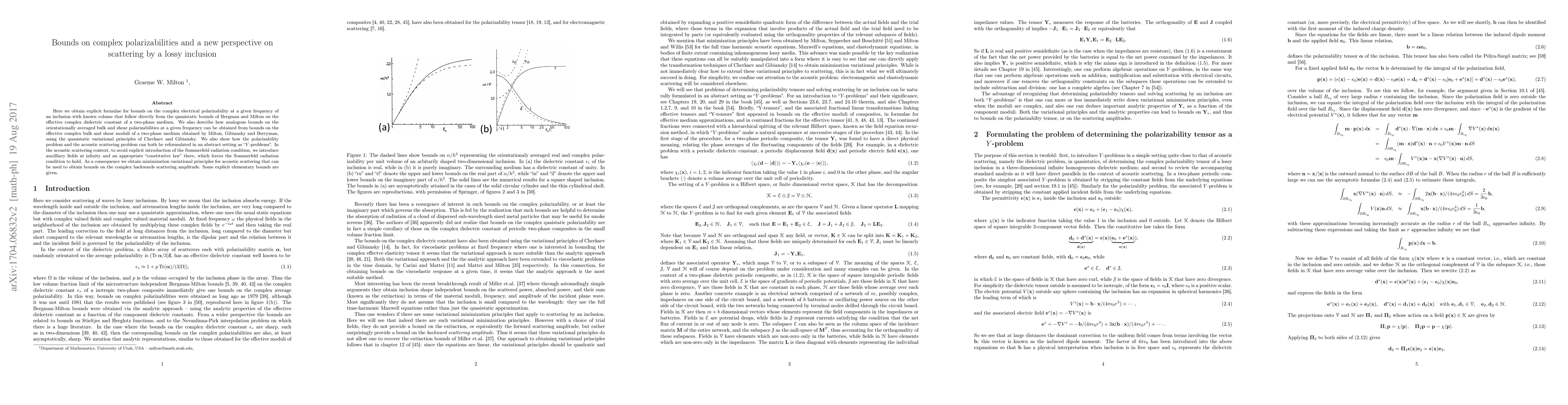 This research derives explicit formulae for bounds on complex polarizability of an inclusion using quasistatic bounds on effective dielectric constants. It also reformulates polarizability and acoustic scattering problems as 'Y-problems', introducing auxiliary fields at infinity to ensure the Sommerfeld radiation condition, thereby obtaining minimization variational principles for scattering and providing elementary bounds.