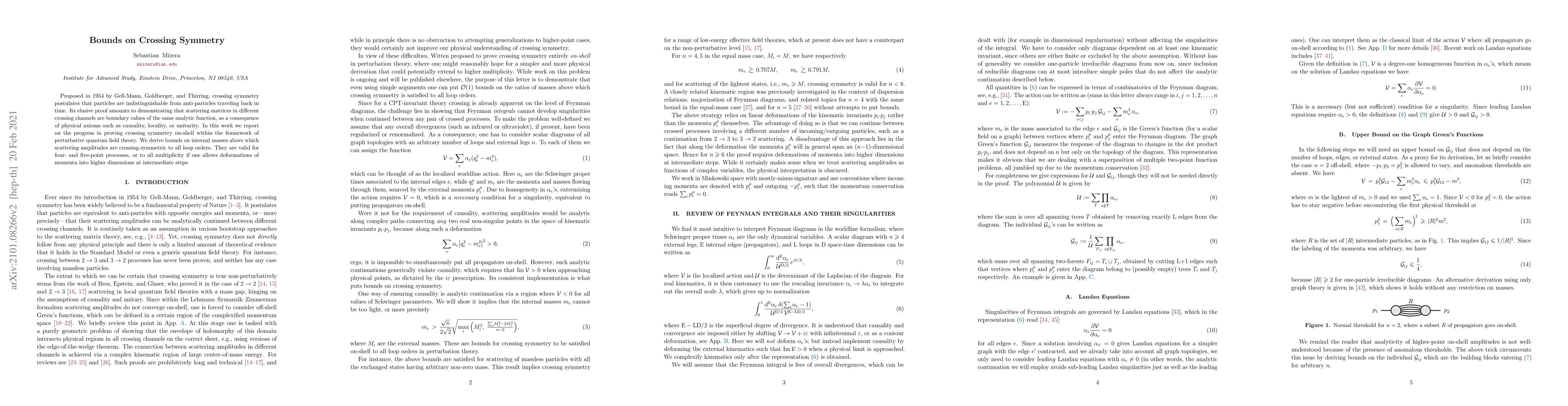 Proposed in 1954 by Gell-Mann, Goldberger, and Thirring, crossing symmetry postulates that particles are indistinguishable from anti-particles traveling back in time. Its elusive proof amounts to demonstrating that scattering matrices in different crossing channels are boundary values of the same analytic function, as a consequence of physical axioms such as causality, locality, or unitarity. In this work we report on the progress in proving crossing symmetry on-shell within the framework of perturbative quantum field theory. We derive bounds on internal masses above which scattering amplitudes are crossing-symmetric to all loop orders. They are valid for four- and five-point processes, or to all multiplicity if one allows deformations of momenta into higher dimensions at intermediate steps.