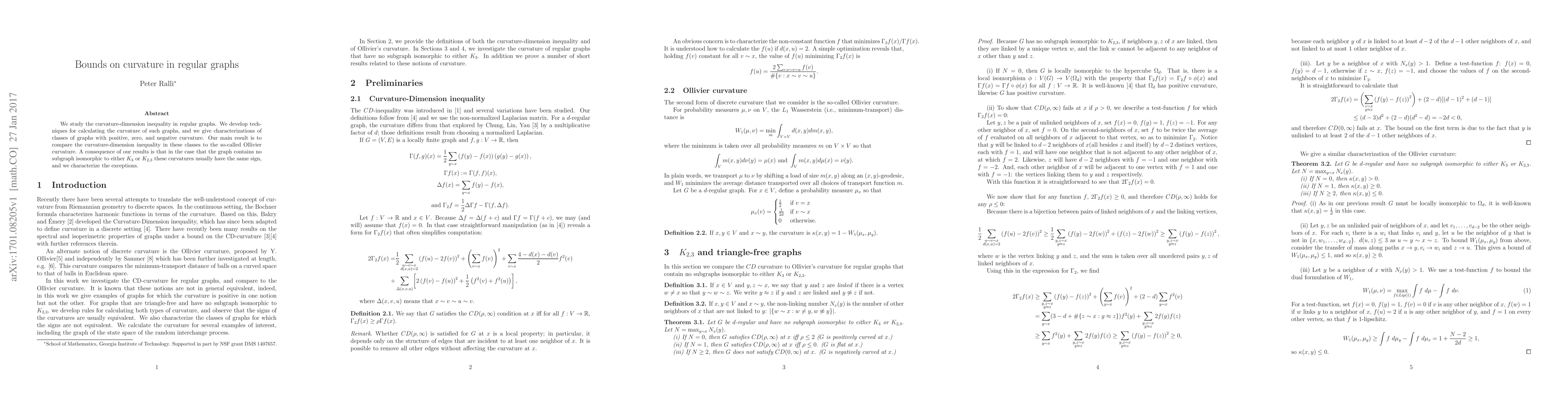 We study the curvature-dimension inequality in regular graphs. We develop techniques for calculating the curvature of such graphs, and we give characterizations of classes of graphs with positive, zero, and negative curvature. Our main result is to compare the curvature-dimension inequality in these classes to the so-called Ollivier curvature. A consequence of our results is that in the case that the graph contains no subgraph isomorphic to either $K_3$ or $K_{2,3}$ these curvatures usually have the same sign, and we characterize the exceptions.