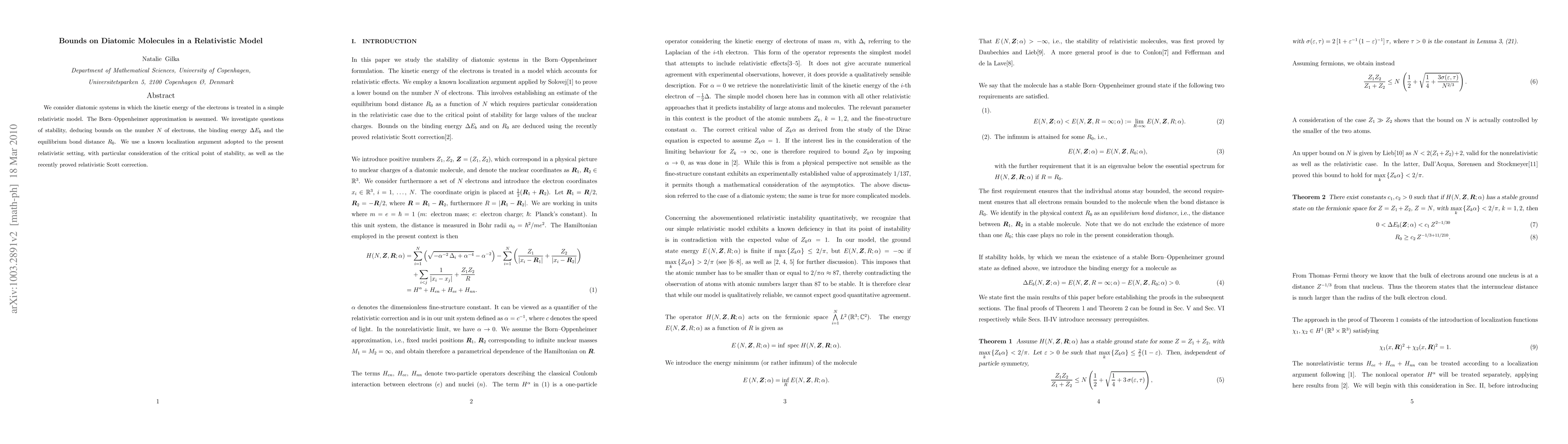 We consider diatomic systems in which the kinetic energy of the electrons is treated in a simple relativistic model. The Born-Oppenheimer approximation is assumed. We investigate questions of stability, deducing bounds on the number $N$ of electrons, the binding energy $\Delta E_b$ and the equilibrium bond distance $R_0$. We use a known localization argument adopted to the present relativistic setting, with particular consideration of the critical point of stability, as well as the recently proved relativistic Scott correction.