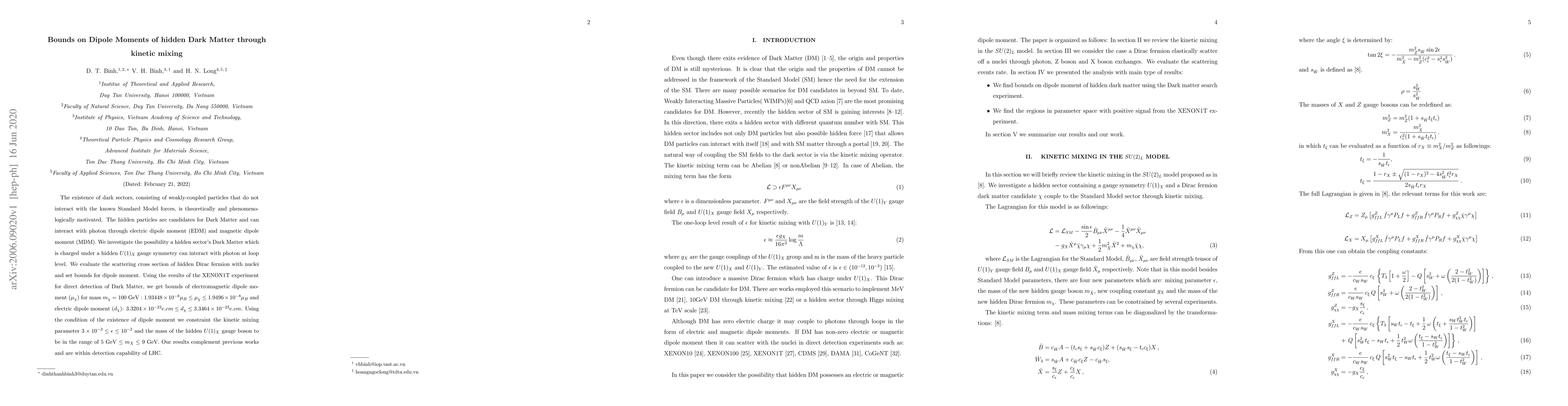 This paper investigates the dipole moments of hidden Dark Matter particles interacting via kinetic mixing with photons, setting bounds on their electromagnetic and electric dipole moments using experimental data from the XENON1T experiment. The study finds bounds for the dipole moments and constrains the kinetic mixing parameter and the mass of the hidden gauge boson, providing complementary results within the detection capability of the LHC.