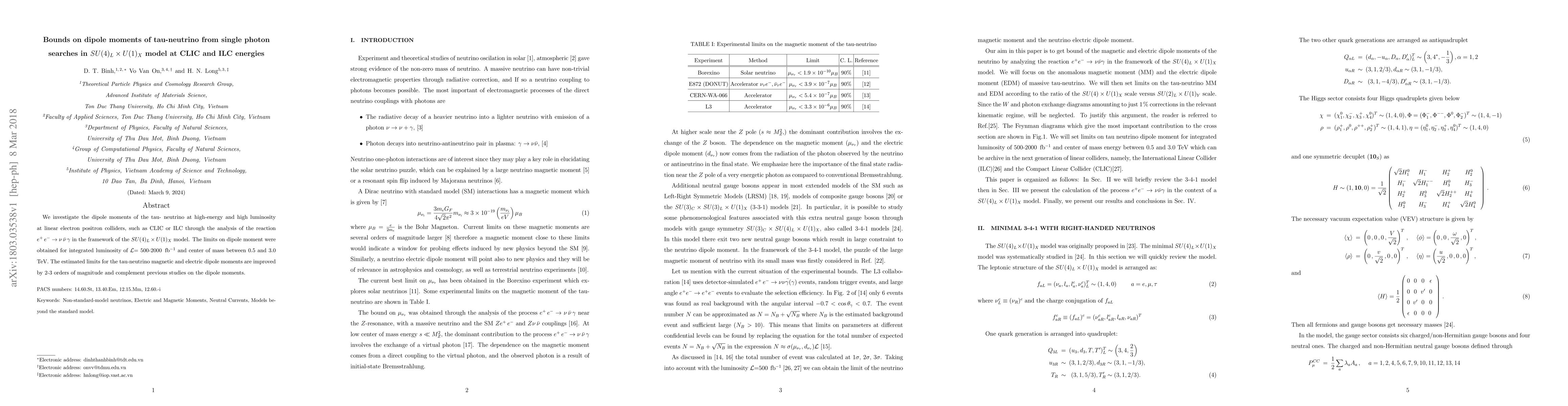 This paper investigates the dipole moments of the tau-neutrino in the $SU(4)_L \times U(1)_X$ model using single photon searches at CLIC and ILC energies. The study improves limits on the tau-neutrino's magnetic and electric dipole moments by 2-3 orders of magnitude through the reaction $e^{+}\, e^{-}\rightarrow \nu\, \bar \nu\, \gamma$ at high luminosity.